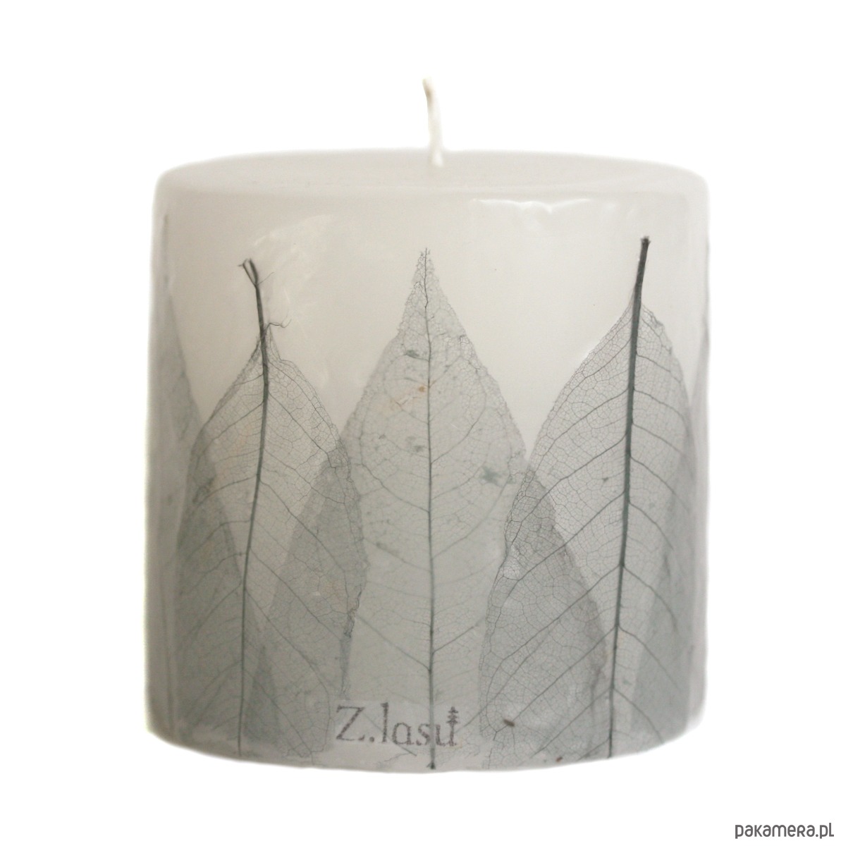Świeca lampionowa ręcznie wykonana, z zatopionymi wytrawionymi liśćmi magnolii.