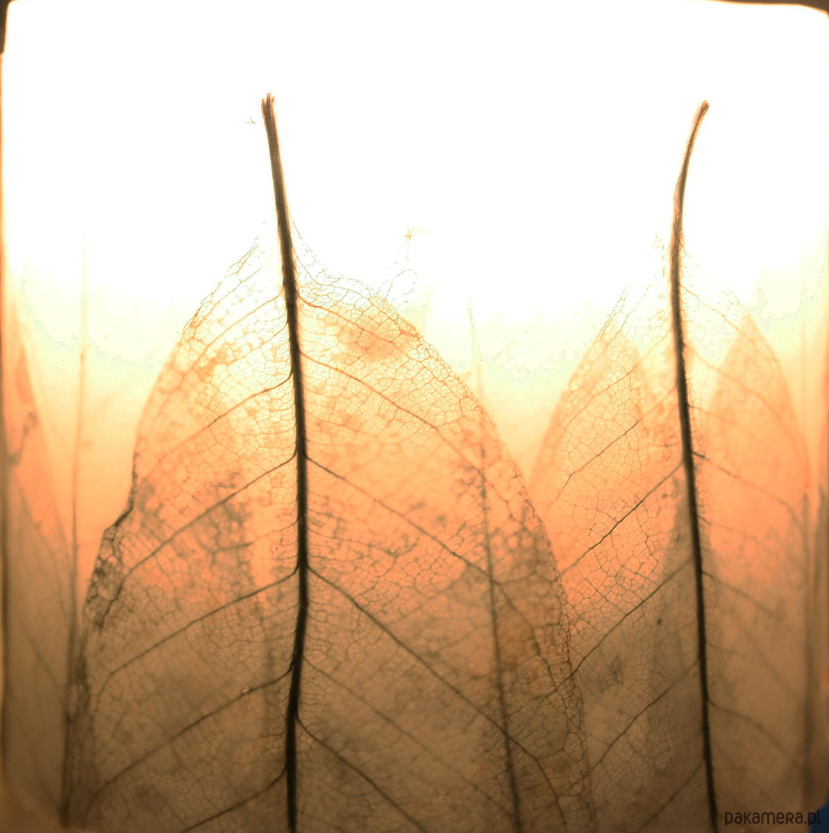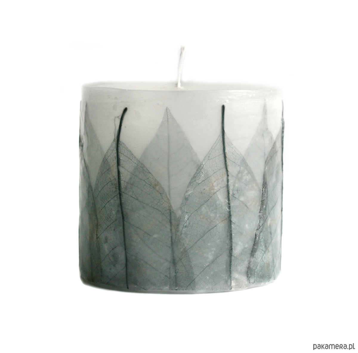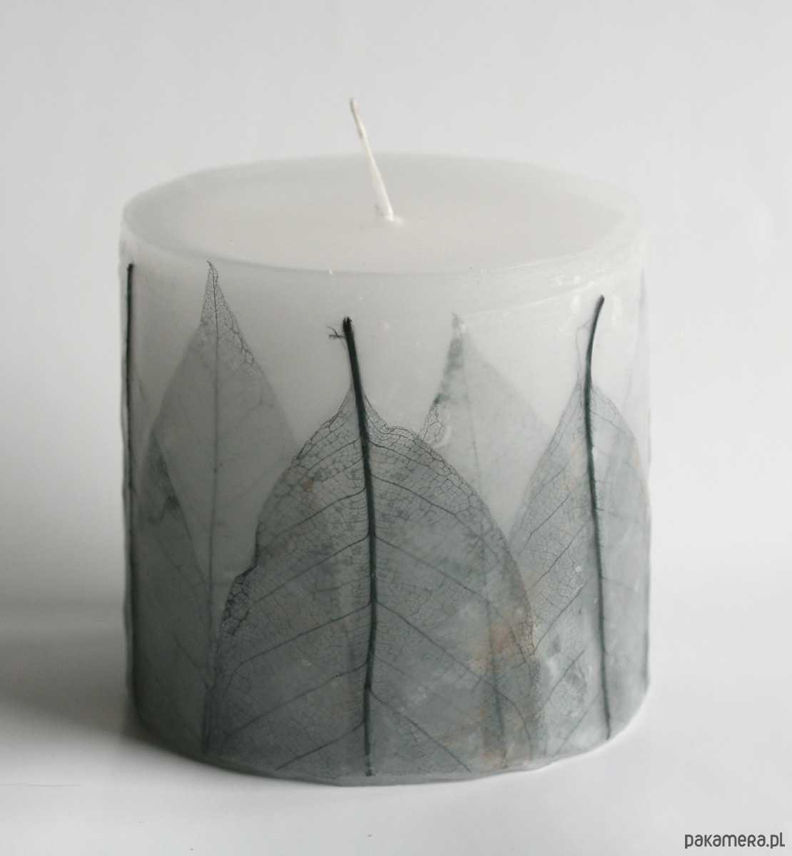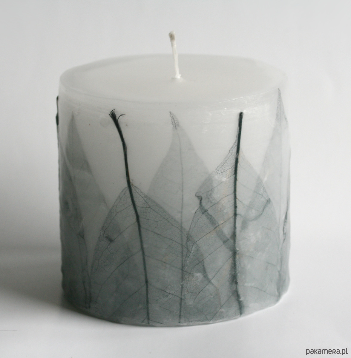 Świeca lampionowa ręcznie wykonana, z zatopionymi wytrawionymi liśćmi.