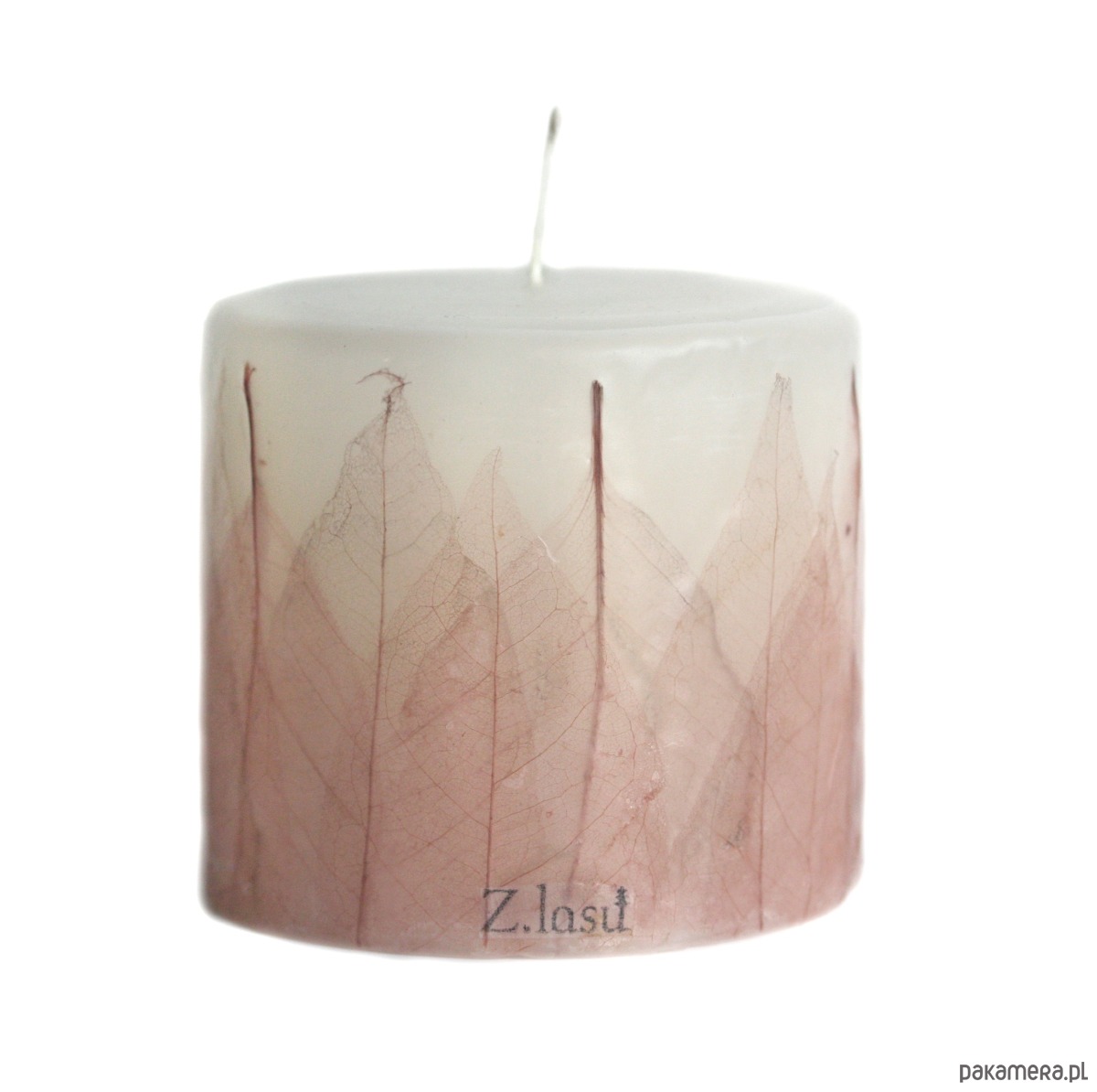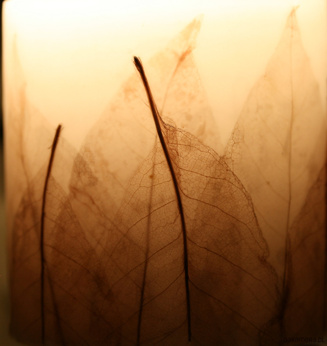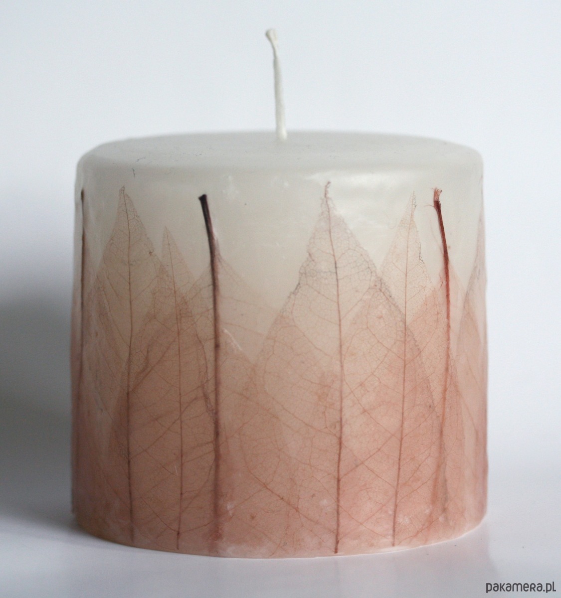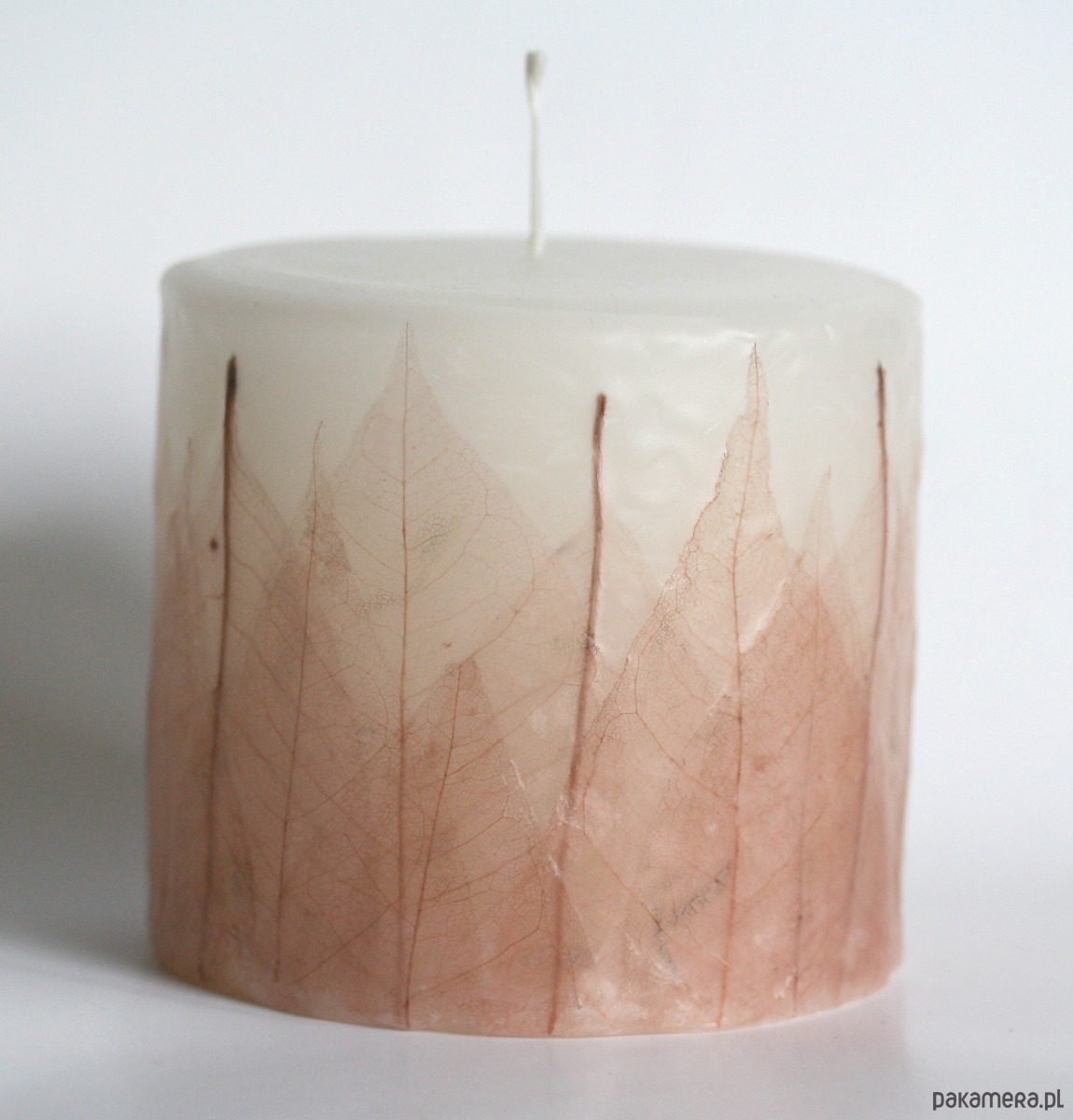 Świeca lampionowa ręcznie wykonana, z zatopionymi wytrawionymi liśćmi.