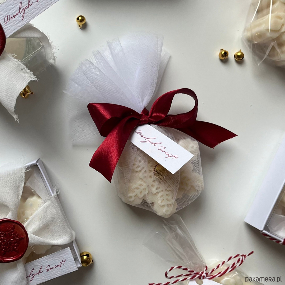 Urocza świeca w kształcie śnieżynki w tiulu z dzwoneczkiem, bordową wstążką i etykietą - pomysł na prezent idealny! 🎁