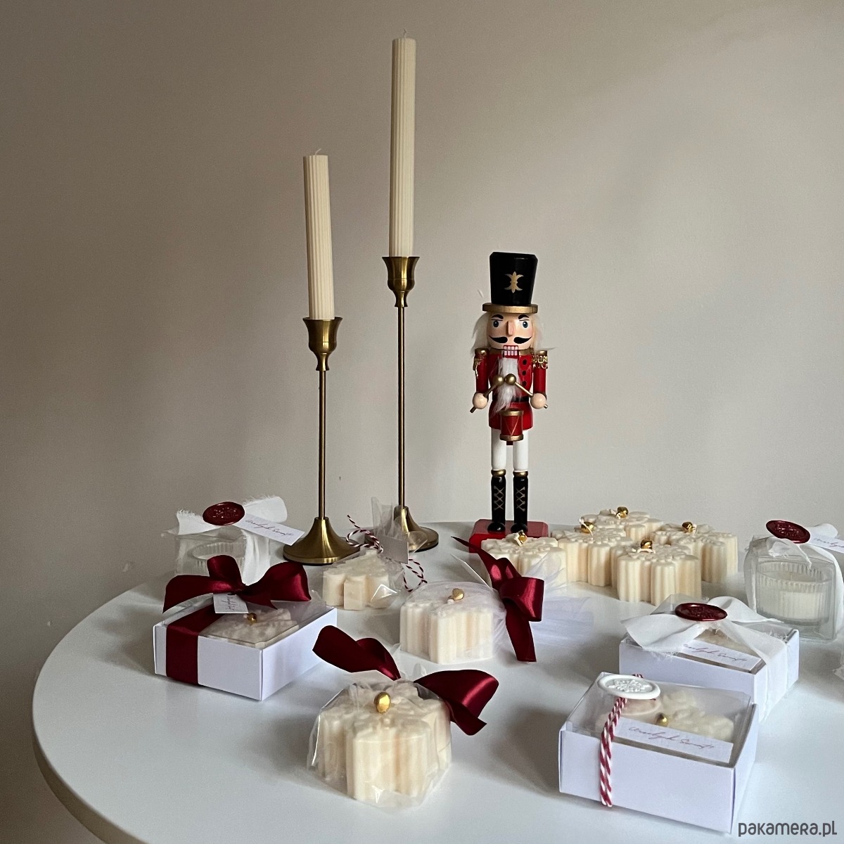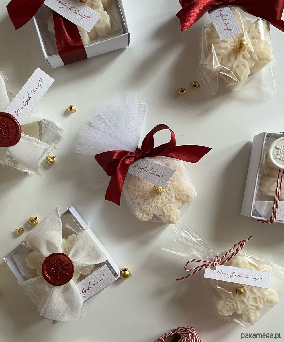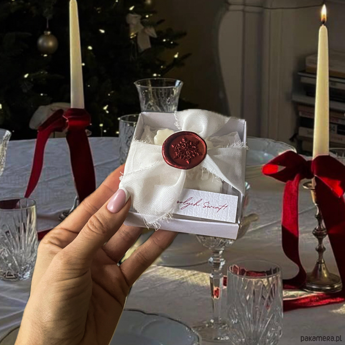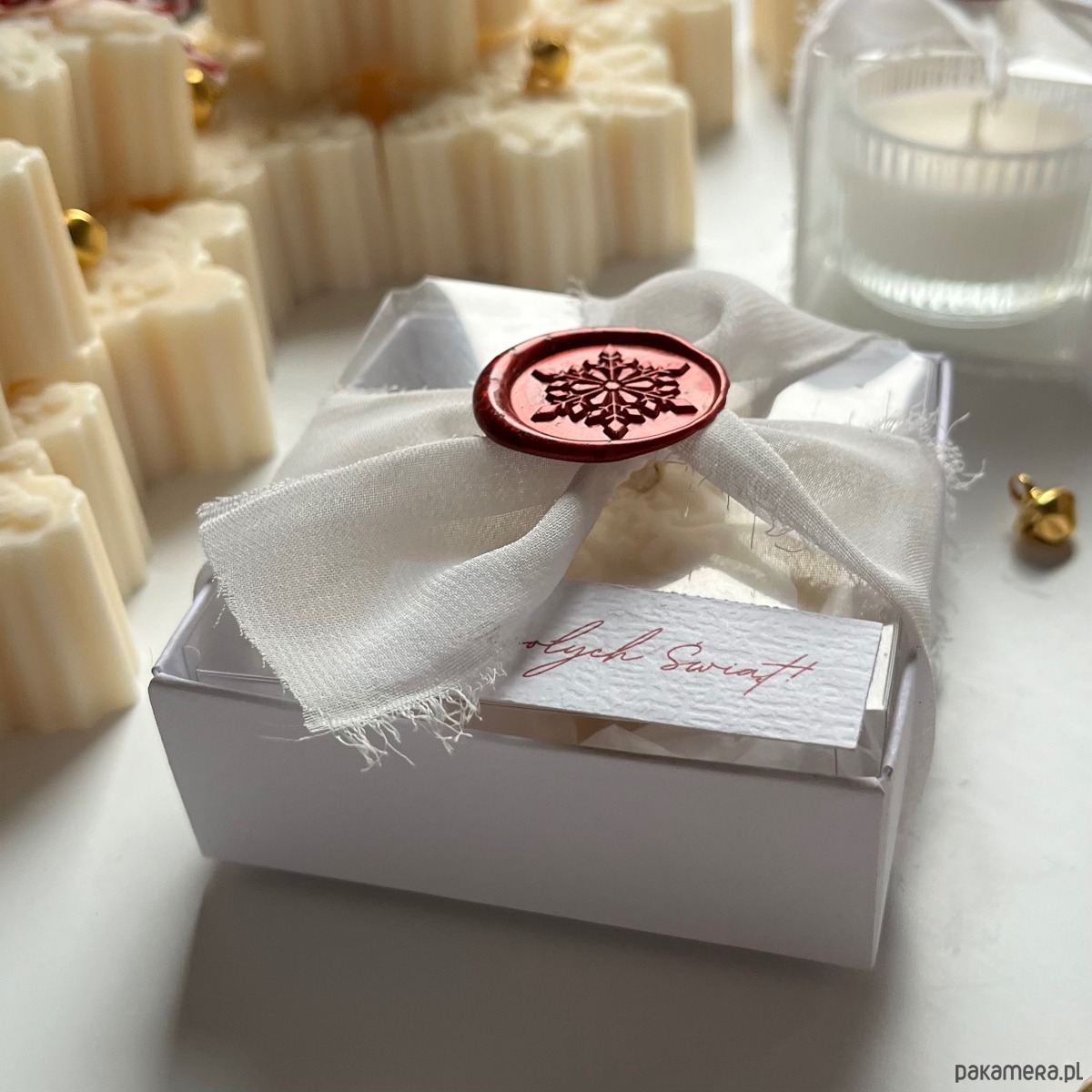 Urocza świeca w kształcie śnieżynki w kartoniku z otwartą szybką 8x8x3 cm, z dzwoneczkiem, szyfonową wstążką oraz lakiem ze śnieżynką w kolorze czerwonym, etykietą - pomysł na prezent idealny! 🎁