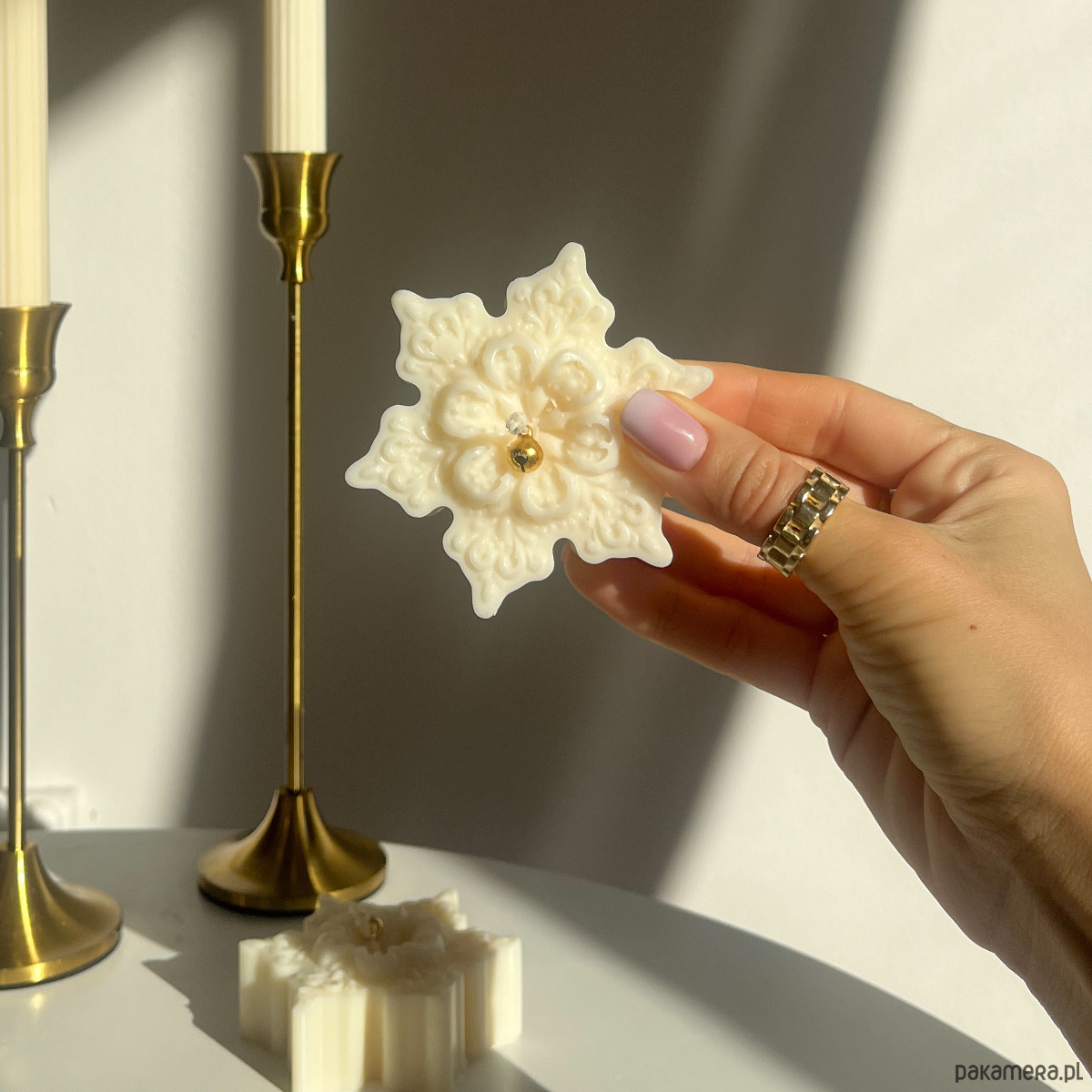 Świeca w kształcie śnieżynki z bogatym zdobieniem to pomysł na mały, ale efektowny upominek.