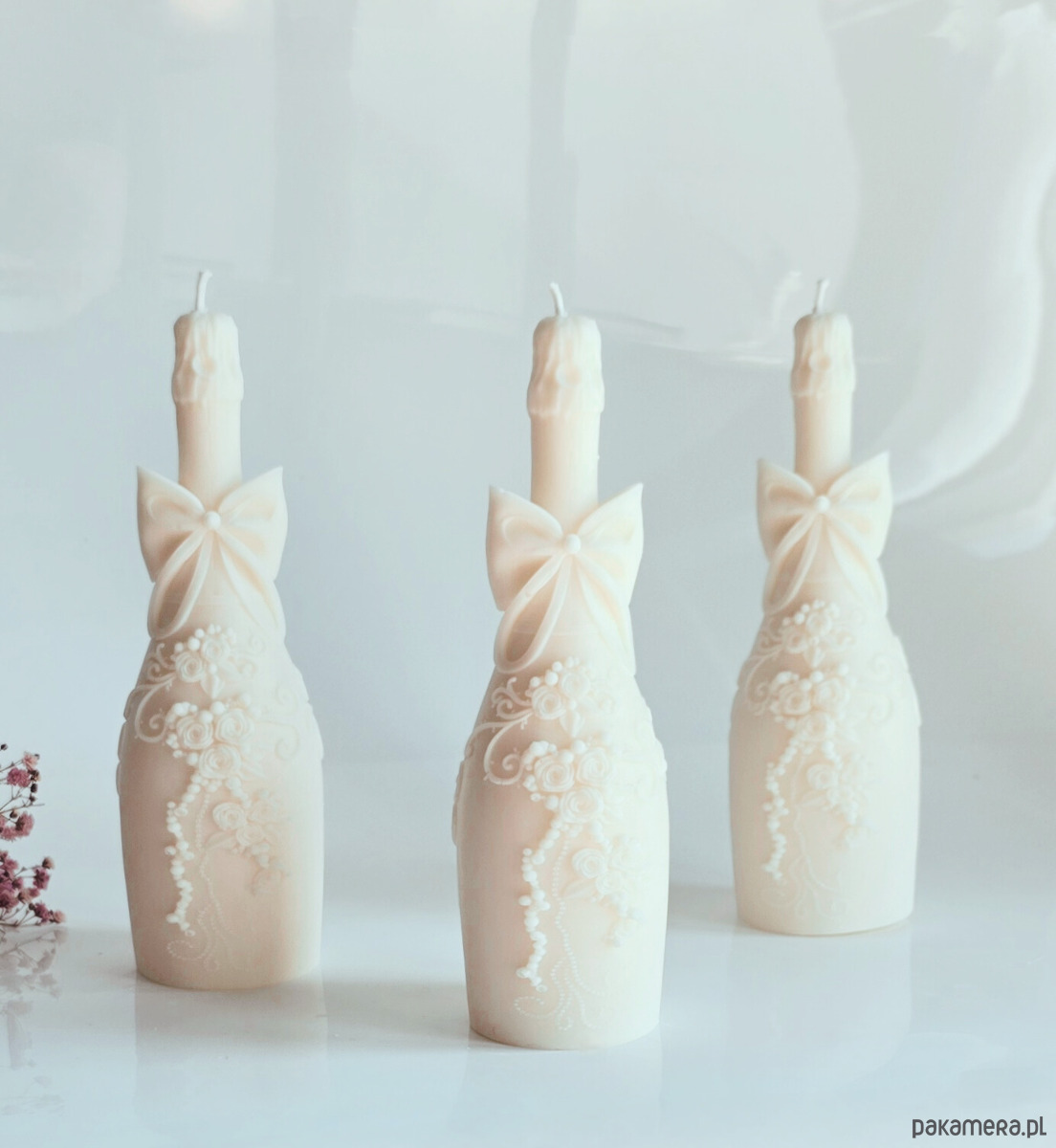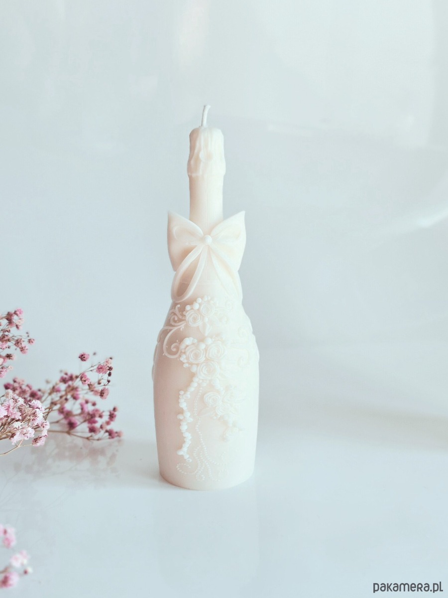 Świeca sojowa naturalna w kształcie butelki szampana z kwiatową ozdobą