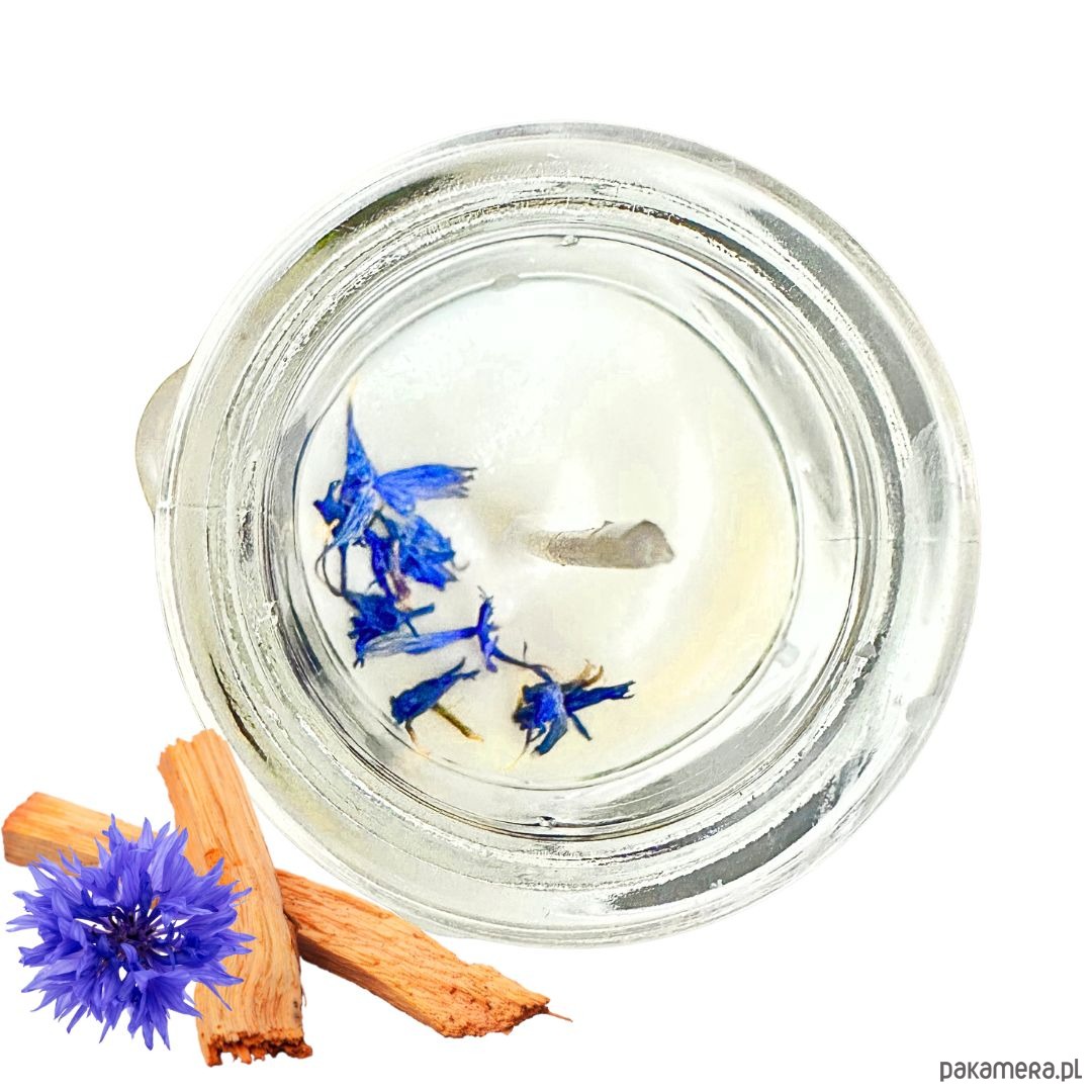 Świeca pali się spokojnym ogniem, nie dymi. Zapakowana jest w tekturowe pudełko, przewiązane kolorowym sznureczkiem. Świeca ozdobiona płatkami niebieskiego bławatka.
