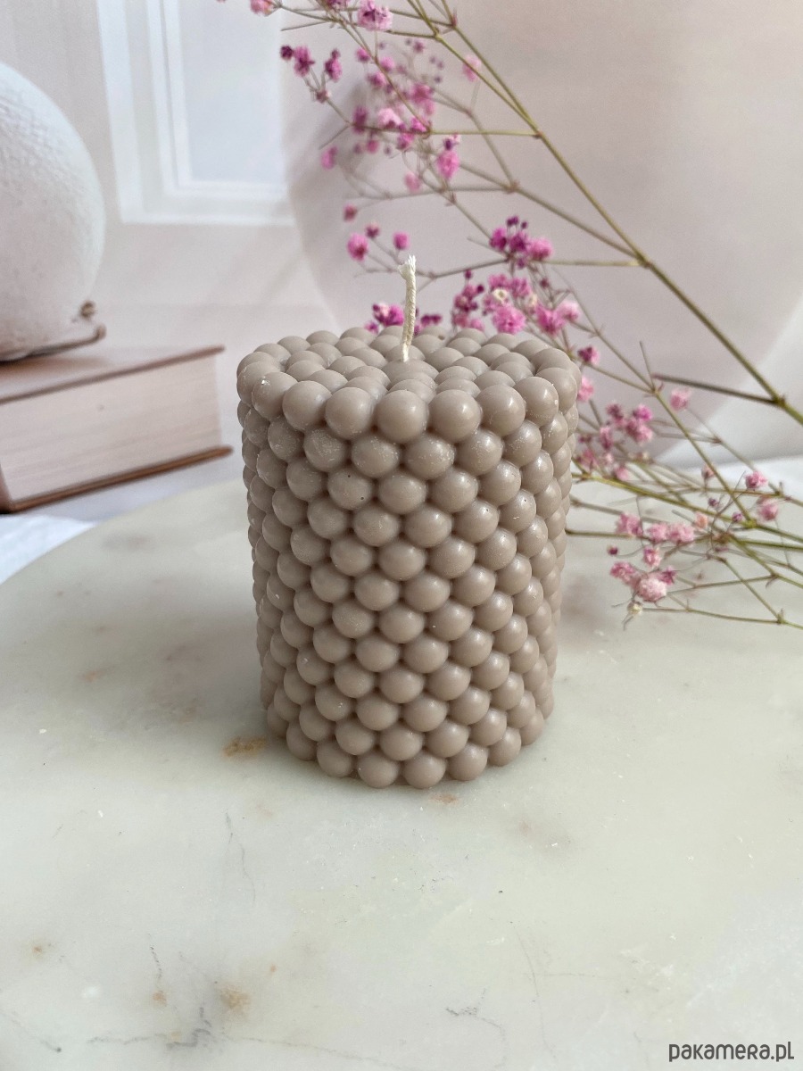 Nasza świeca Bubbles to wyjątkowa dekoracja stworzona z naturalnego wosku sojowego. Jej geometryczna forma złożona z regularnych kuleczek przyciąga wzrok i czyni ją nie tylko źródłem światła, ale też stylowym dodatkiem do wnętrza.