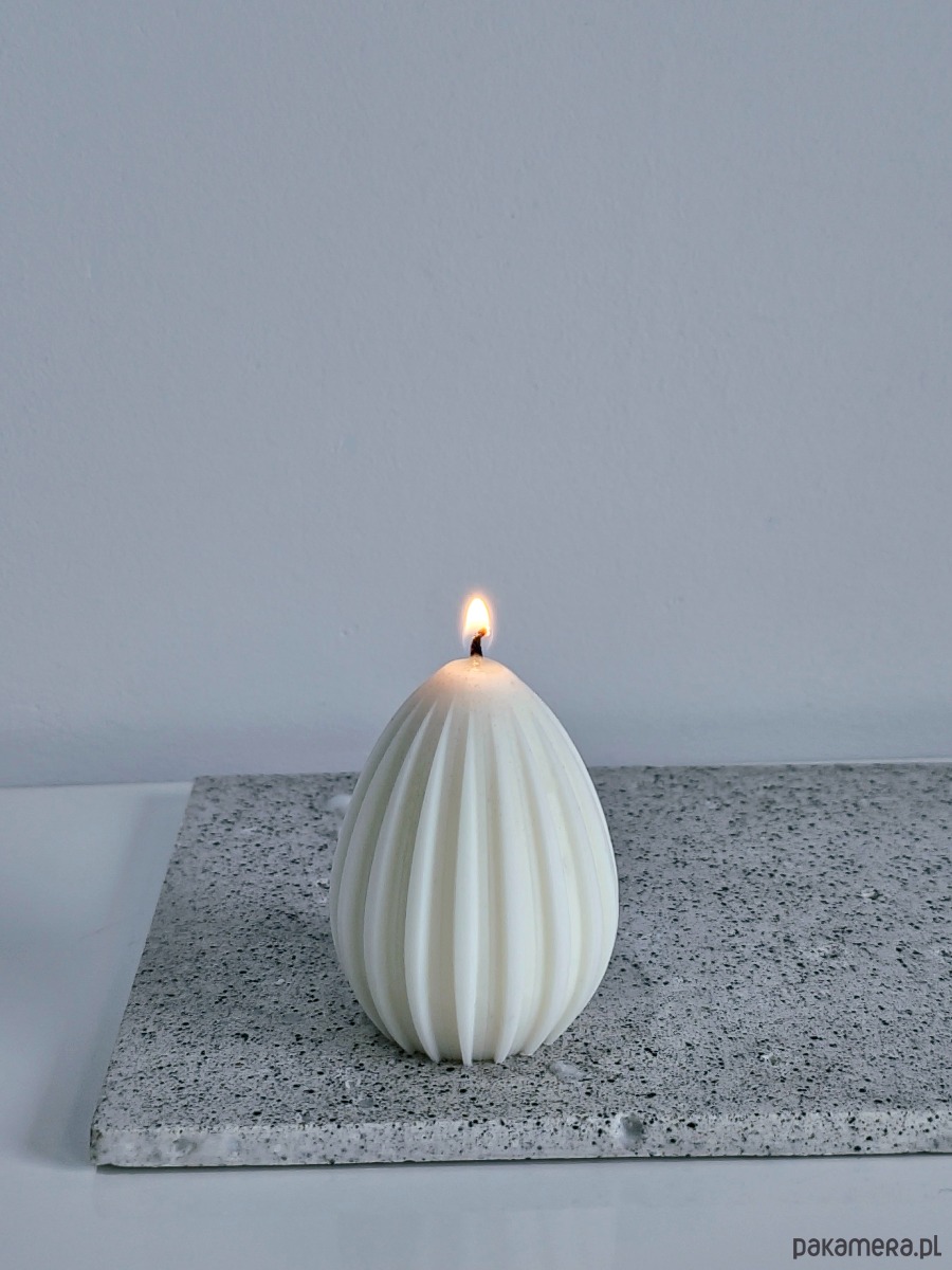 Świeca w formie jajka z wyrazistą ryflowaną strukturą, która nadaje jej nowoczesny, dekoracyjny charakter. Elegancki akcent wielkanocny pasujący do minimalistycznych wnętrz.
