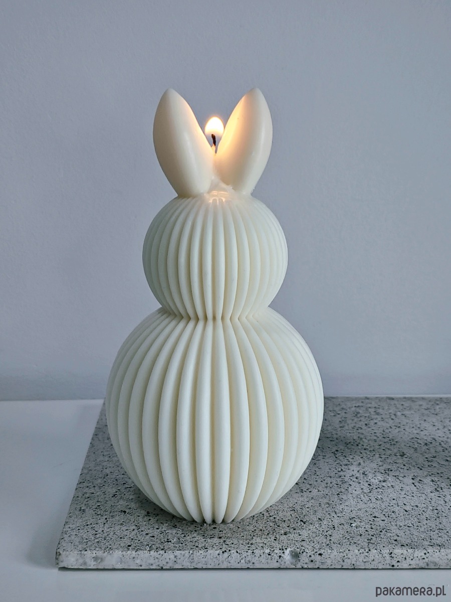 Duża świeca w formie zająca z ryflowaną powierzchnią, która podkreśla jej elegancki, dekoracyjny charakter. Wyrazisty element wielkanocnej aranżacji i wyjątkowa ozdoba wnętrza.