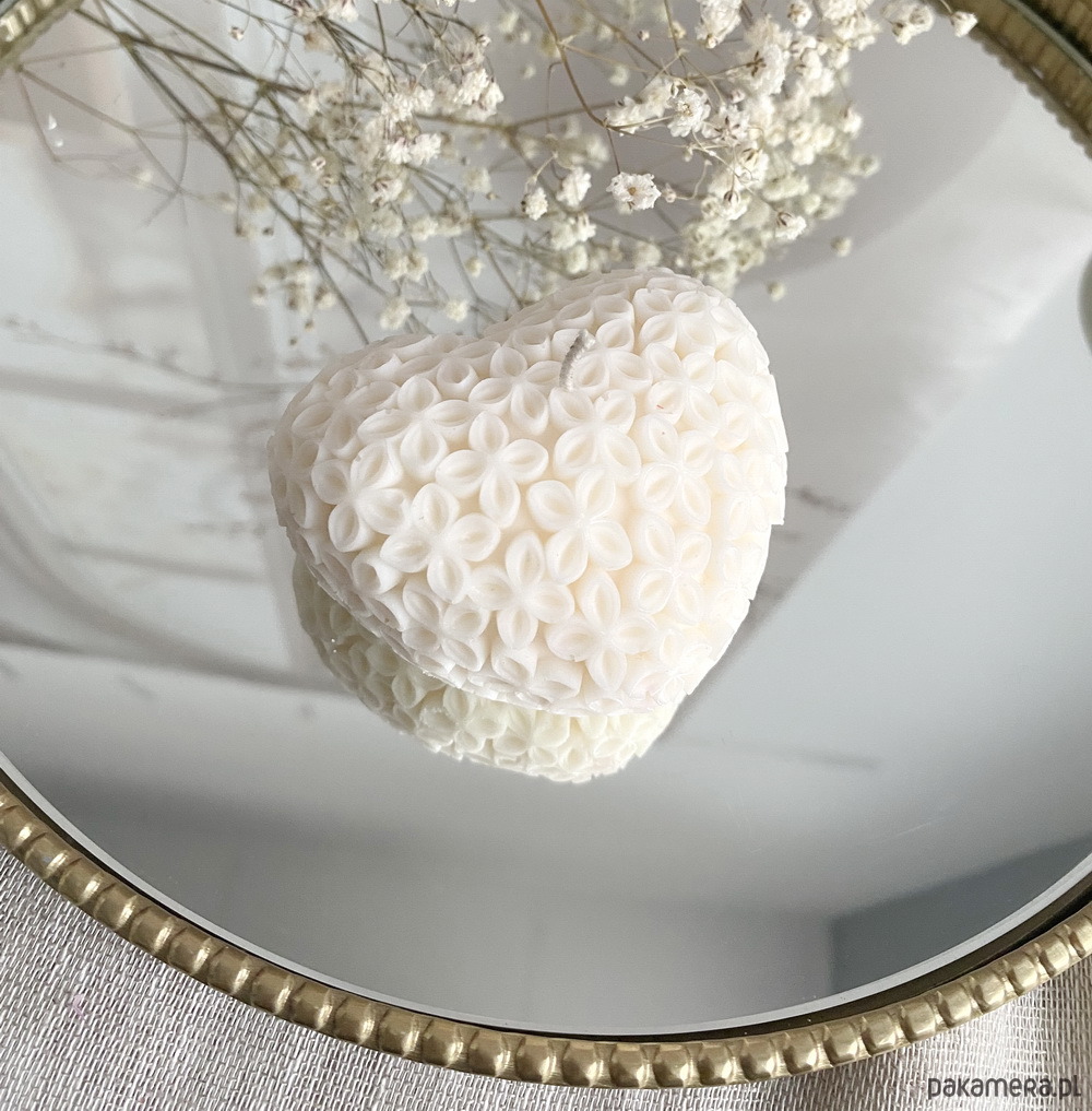Romantyczna i wyjątkowa- świeca w kształcie serca ozdobiona delikatnymi kwiecistymi detalami to idealny dodatek do wnętrz, które pragną ciepła i elegancji. Doskonała na prezent, dekorację stołu lub jako subtelny akcent w sypialni czy salonie. Ręcznie wykonana, z dbałością o każdy szczegół.