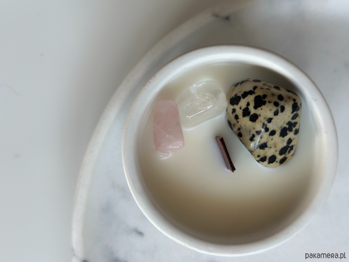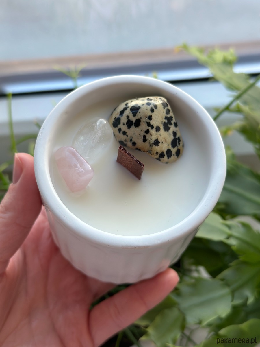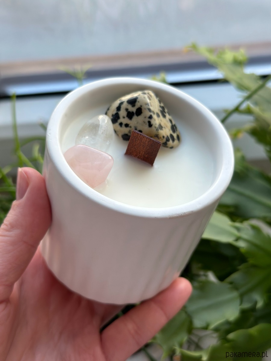 Świeca Sojowa Harmonii Naturalnej z Jaspisem Dalmatyńczykiem, Kwarcem Różowym i Kryształem Górskim to nie tylko źródło światła, to także źródło inspiracji i zrozumienia piękna natury. Pozwól jej przyprowadzić do Twojego życia spokój i radość.