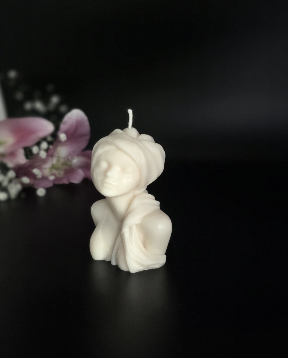 Forma kobiety z turbanem symbolizuje harmonię, troskę o siebie i wewnętrzną równowagę, czyniąc świecę idealnym prezentem dla osoby ceniącej minimalizm, naturalne materiały i świadome wybory.