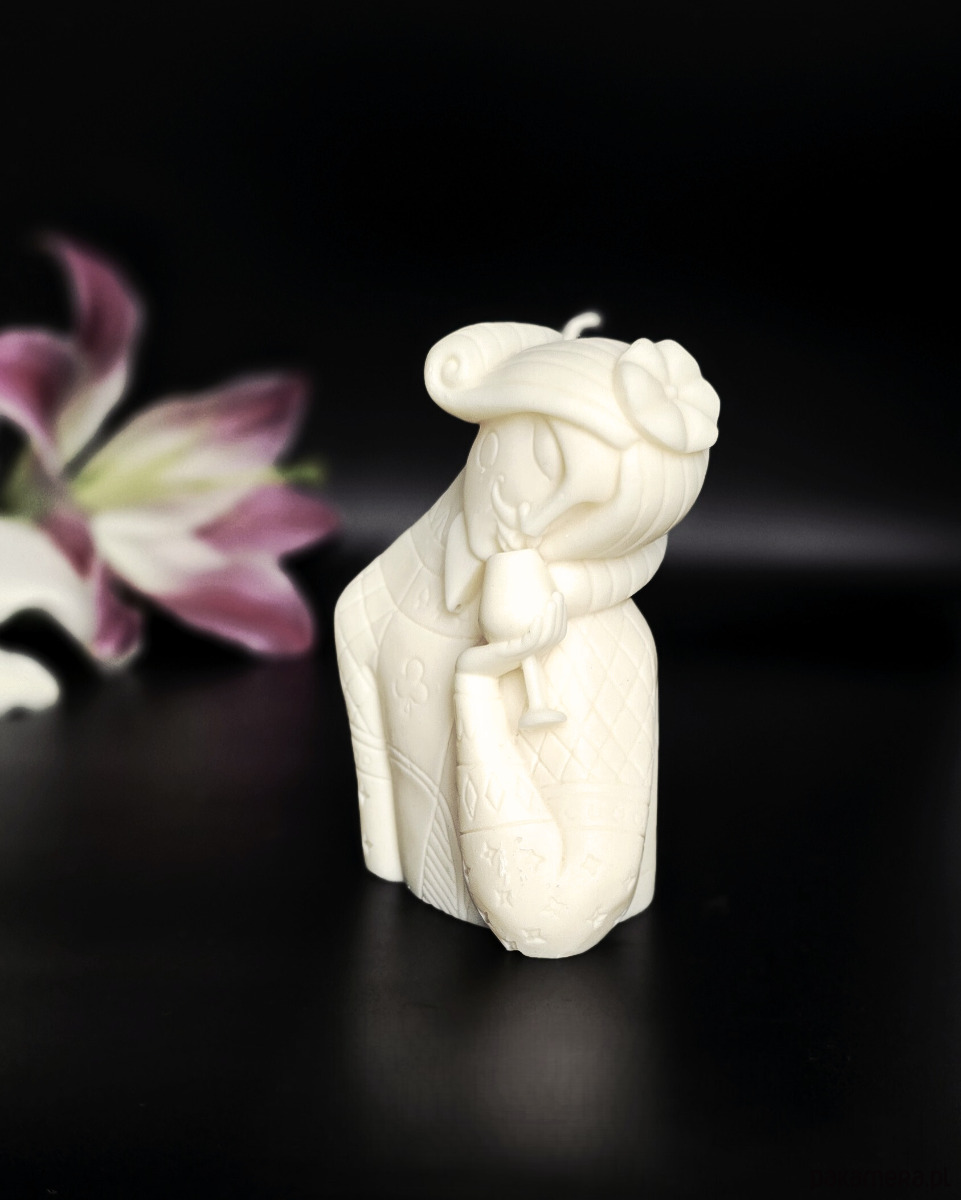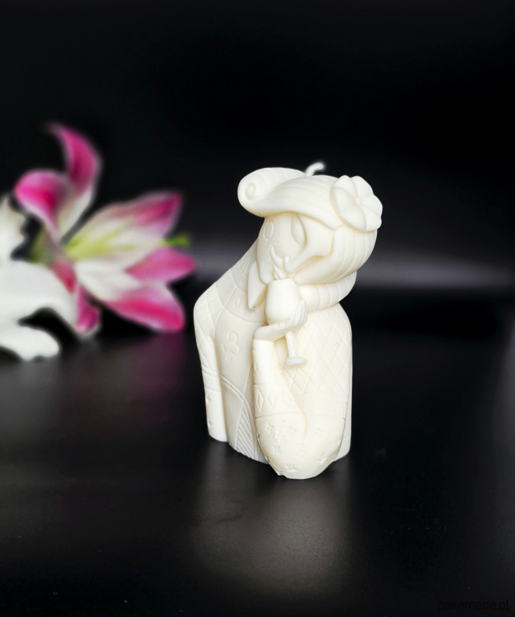 Świeca w kształcie Króla Pik najlepiej prezentuje się jako element dekoracyjny – jeśli zdecydujesz się ją zapalić, używaj podstawki odpornej na ciepło.