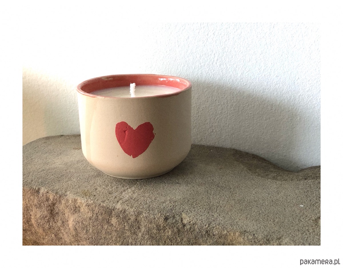 Świeca sojowa Love, po której można wykorzystać czarkę na herbatę lub kawę. Wosk sojowy, olejki delikatne 100% naturalne (trawa cytrynowa i mandarynka).