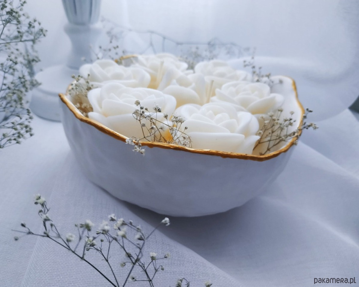 Świeca sojowa w pojemniku z gipsu ceramicznego.