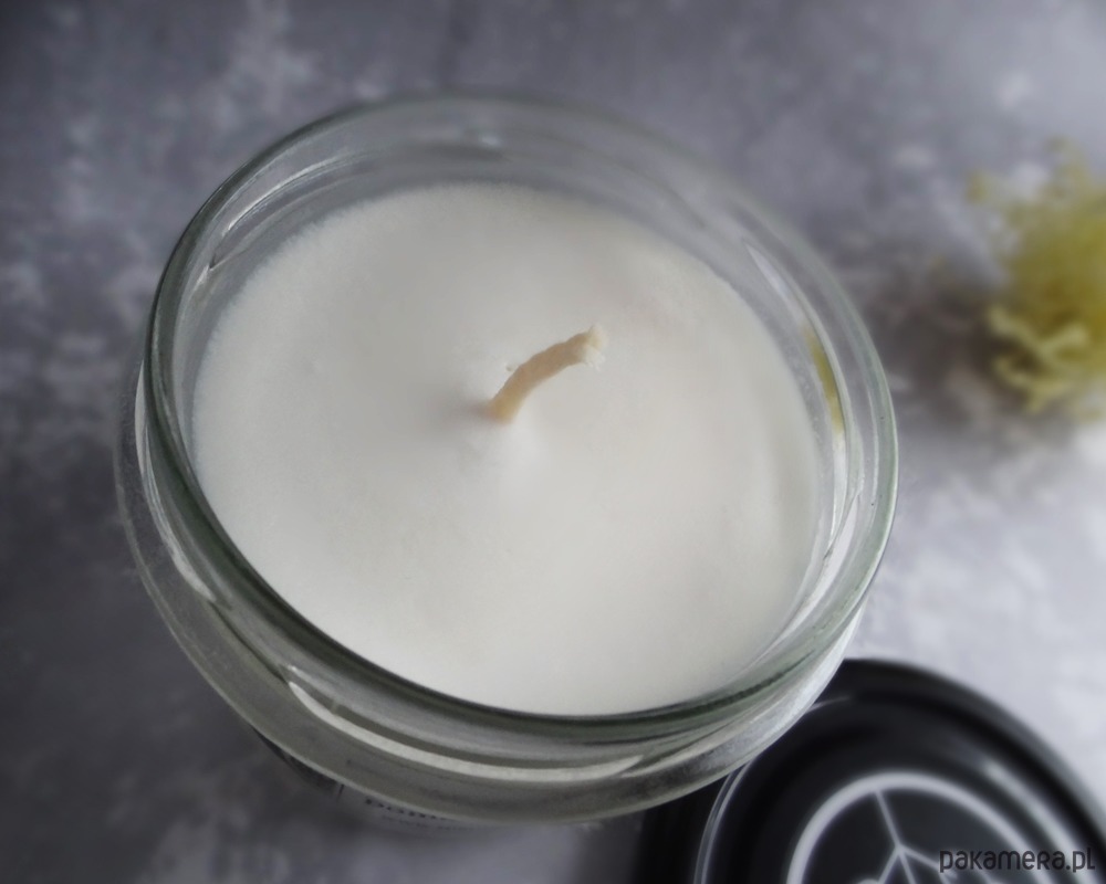 Świeca wykonana jest z wosku sojowego, zamknięta jest w szklanym słoju z czarnym wieczkiem.