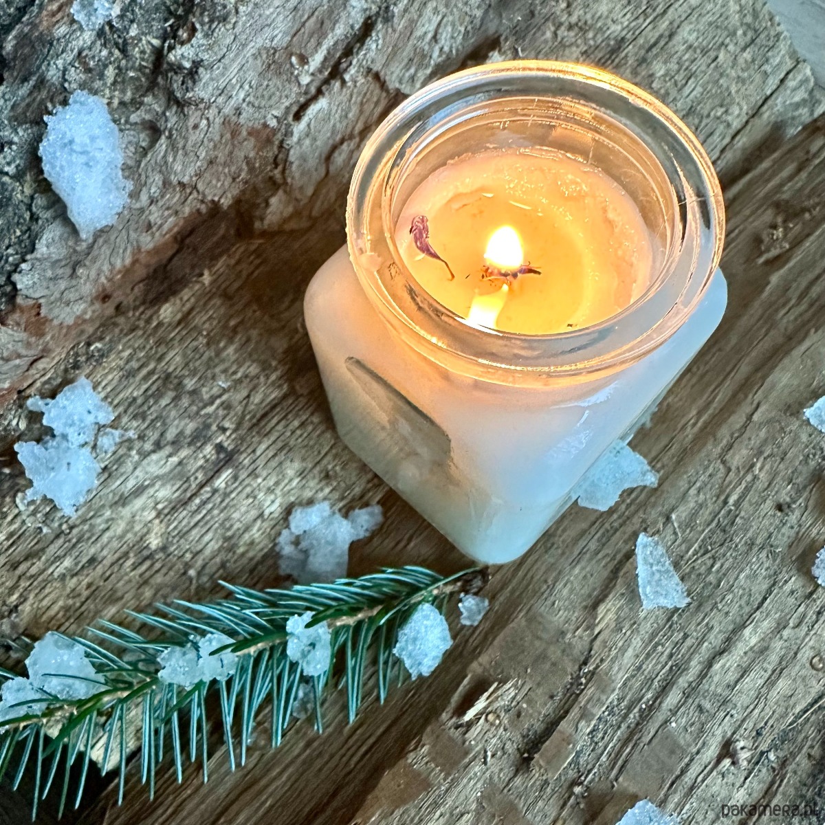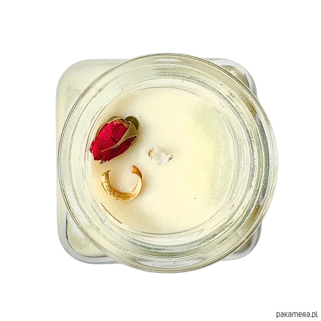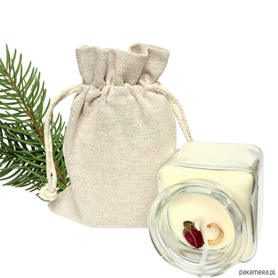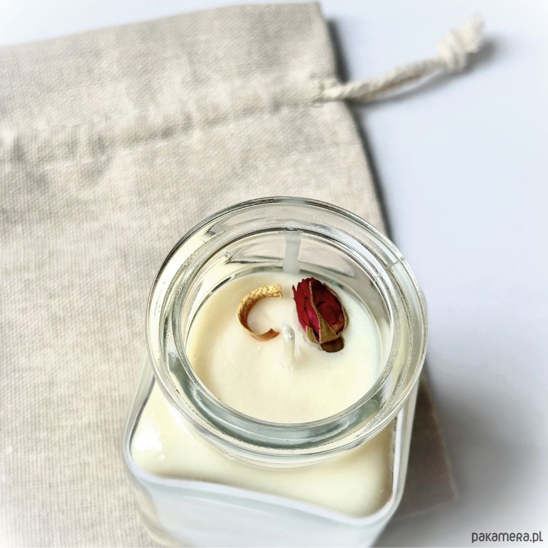 Świeca pali się spokojnym ogniem, nie dymi. Zapakowana jest w woreczek bawełniany, ozdobiona pączkiem róży i płatkiem kwiatów pomarańczy.