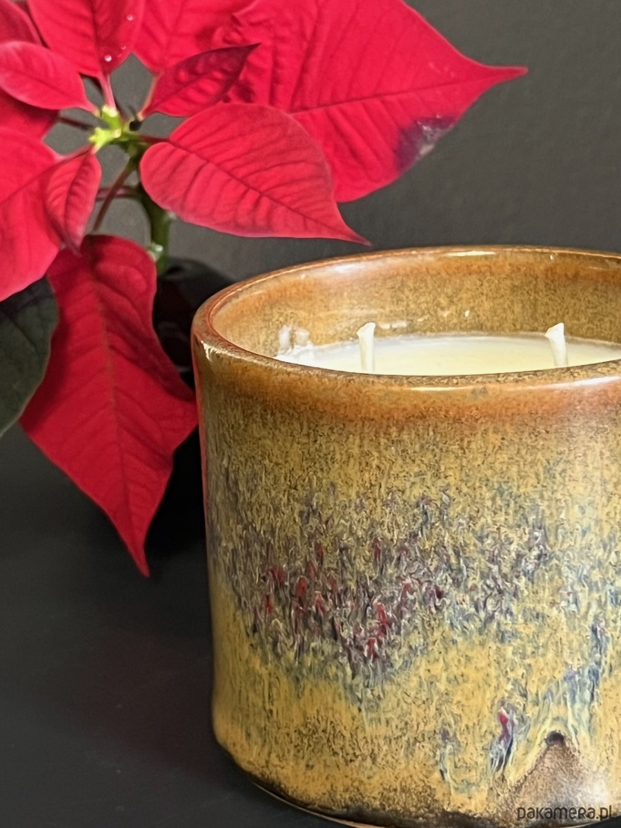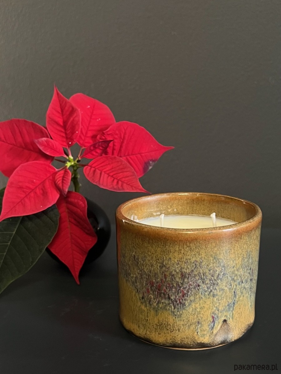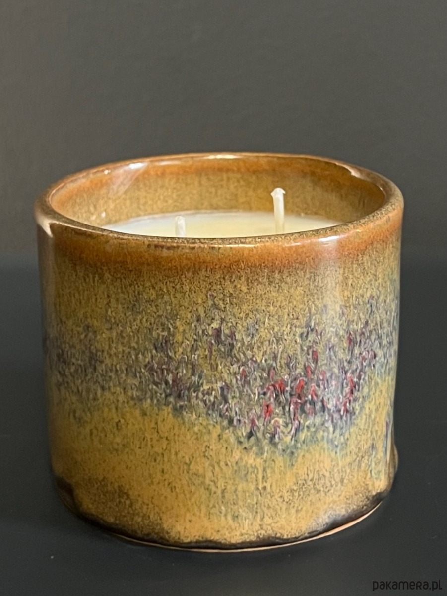 Wosk znajduje się w prostym, oryginalnym, ceramicznym pojemniku, który po wypaleniu świecy możesz wykorzystać jak tylko chcesz (np. kubek, doniczka). Każdy pojemnik jest oryginalny, szkliwa przepływają inaczej, co daje niepowtarzalne efekty kolorystyczne.