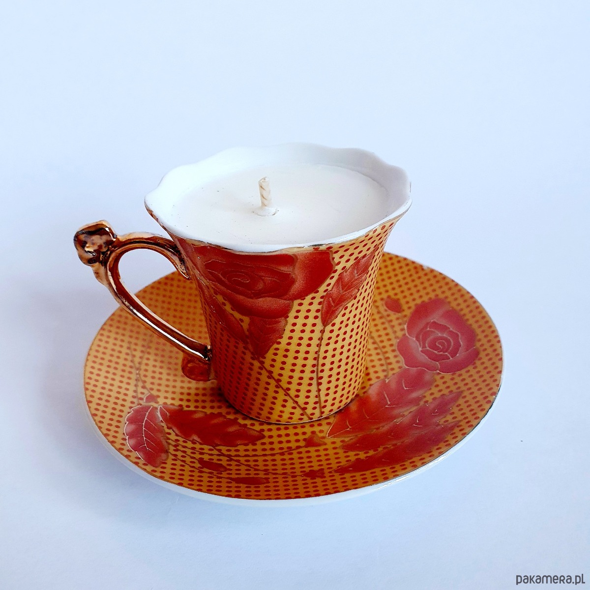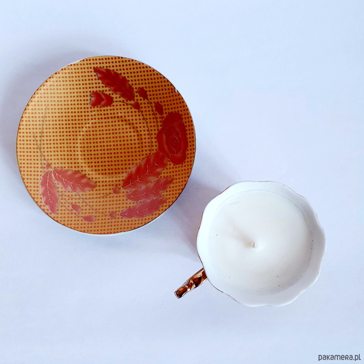 PEŁNA Pracownia Rękodzieła napełniła mnie światłem. Stałam się świecą, a jak się wypalę, mogę być ponownie pełna aromatu herbaty lub kawy. Czuję się bardzo ekologicznie. Wosk sojowy, który mnie wypełnia, jest w pełni naturalny, pochodzi z upraw europejskich i nie jest testowany na zwierzętach. Posiadam knot bawełniany, impregnowany woskiem naturalnym, moja blaszka nie posiada ołowiu. Jestem bezzapachowa.