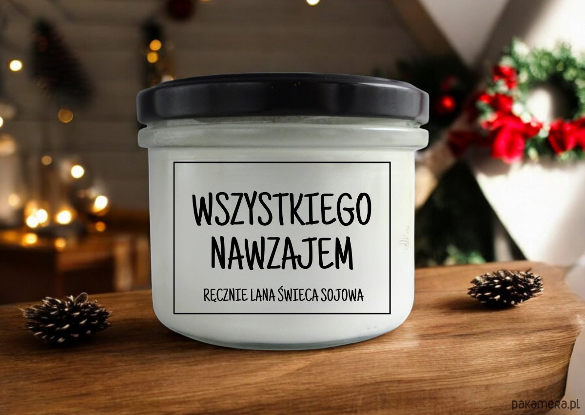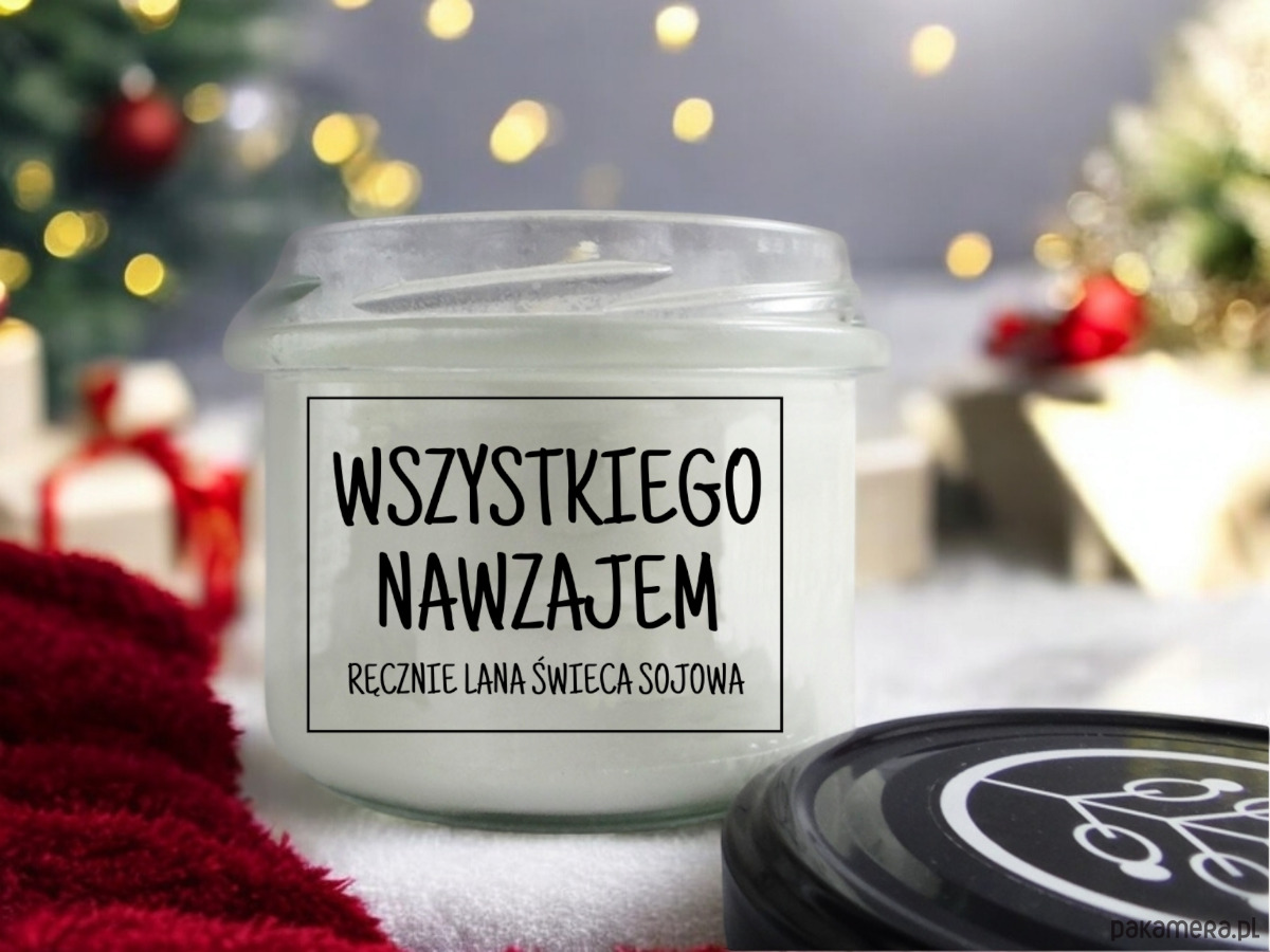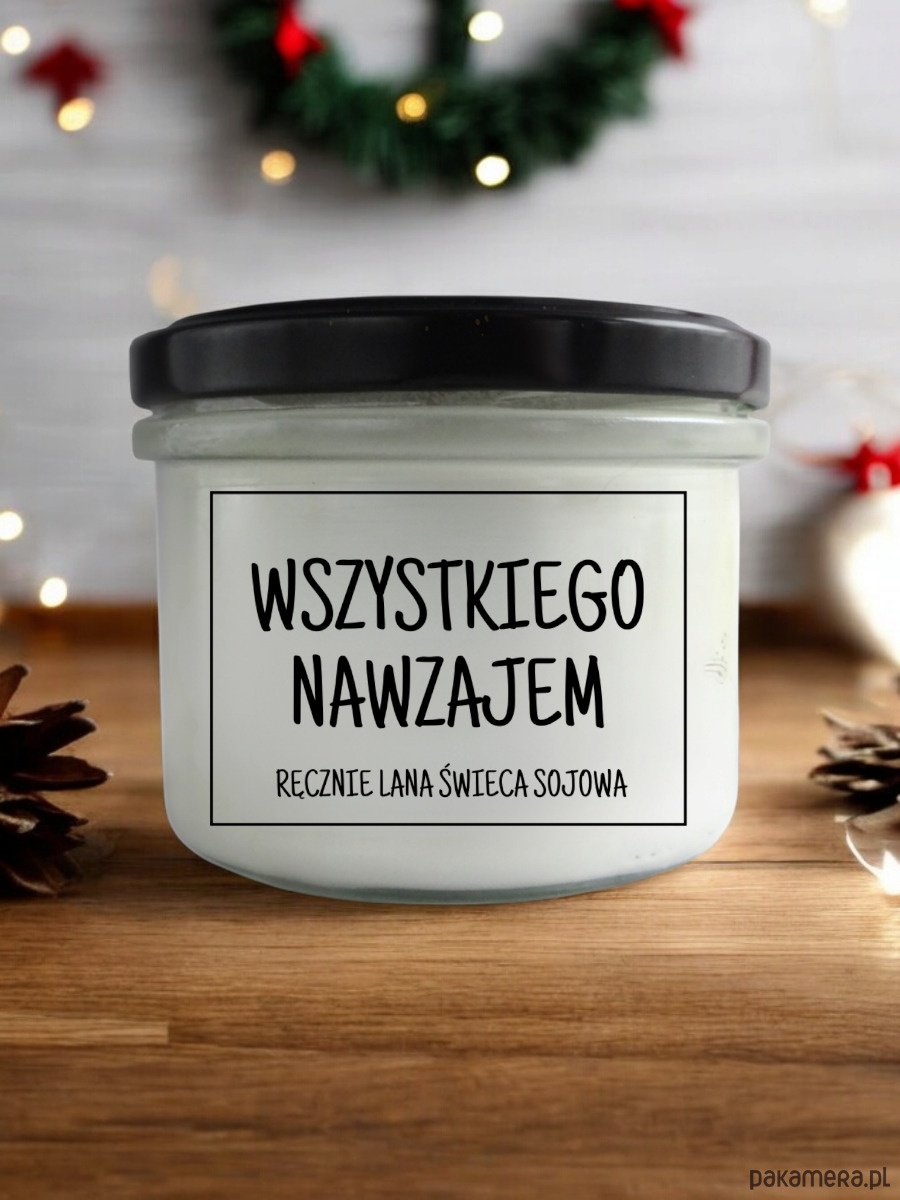 Świeca z wosku sojowego w szklanym słoju z czarnym wieczkiem z napsem WSZYSTKIEGO NAWZAJEM