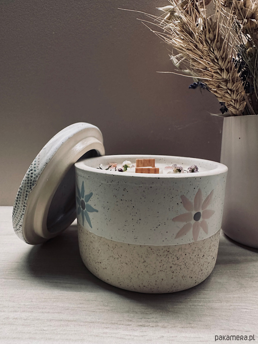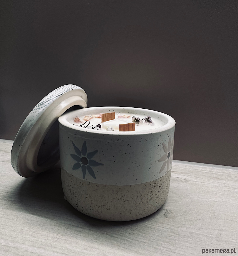 Skład: 100% naturalny wosk sojowy, olejek zapachowy , knot drewniany, zasuszone i zaimpregnowane kwiatki.