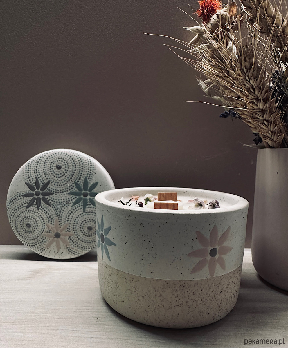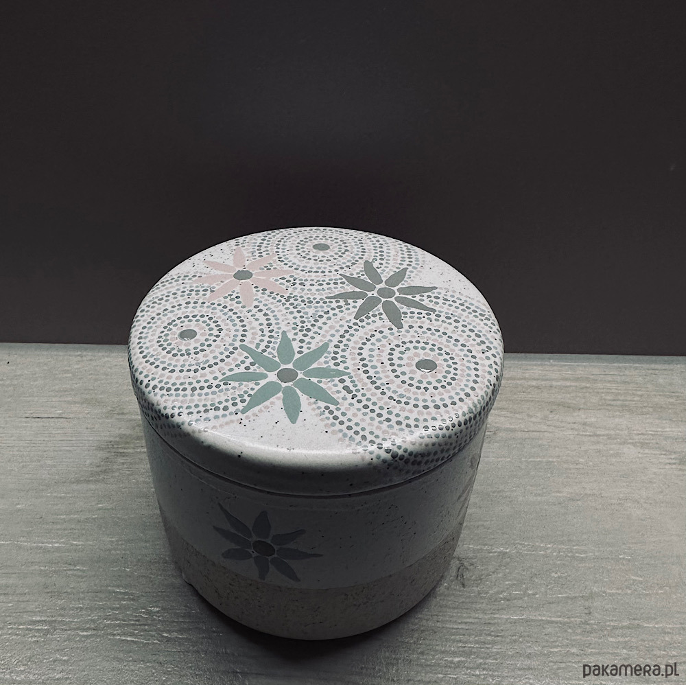 Szarość ceramicznego naczynia wspaniale współgra z pastelowymi kolorami kwiatowej mandali.