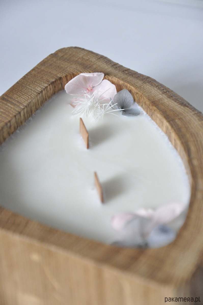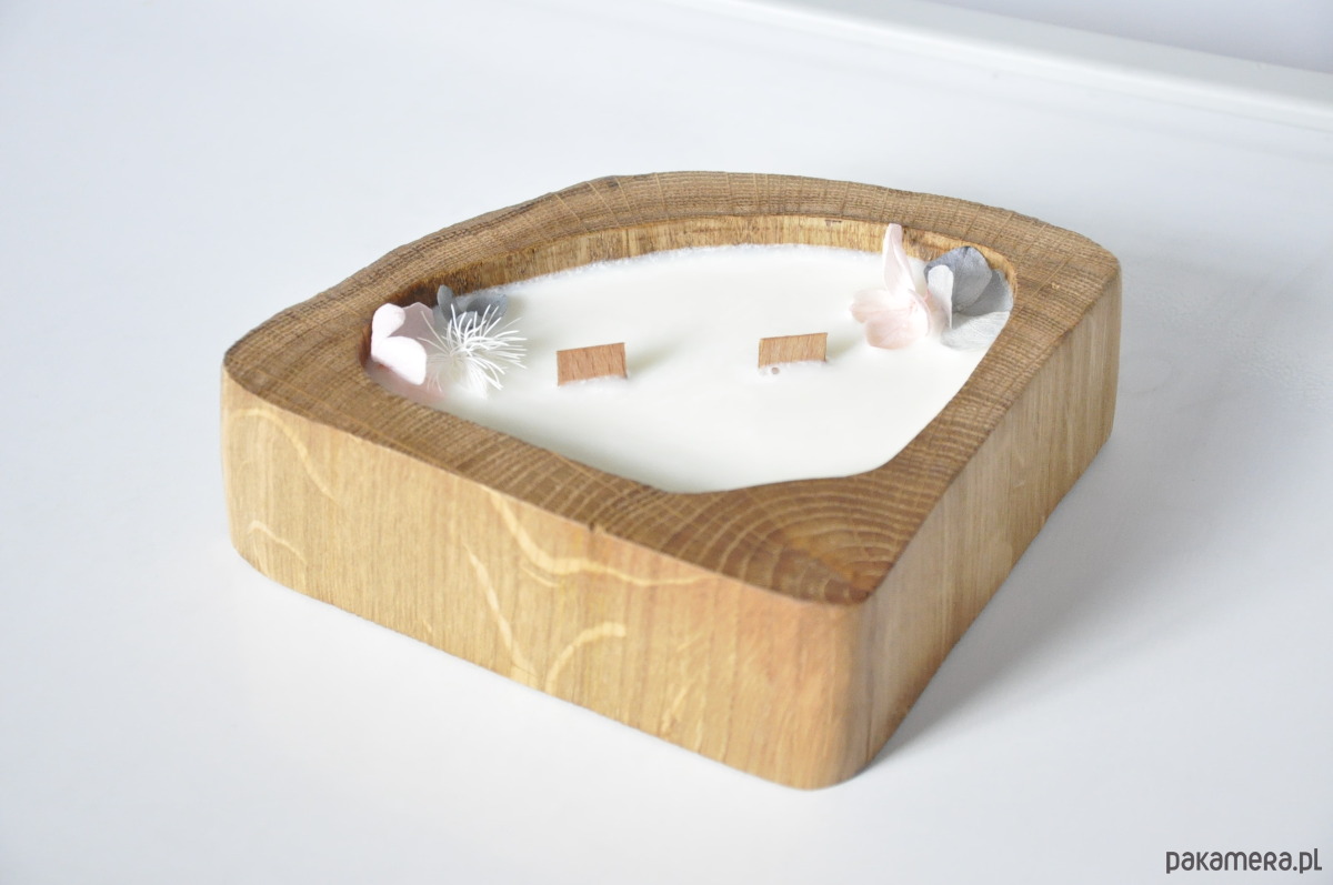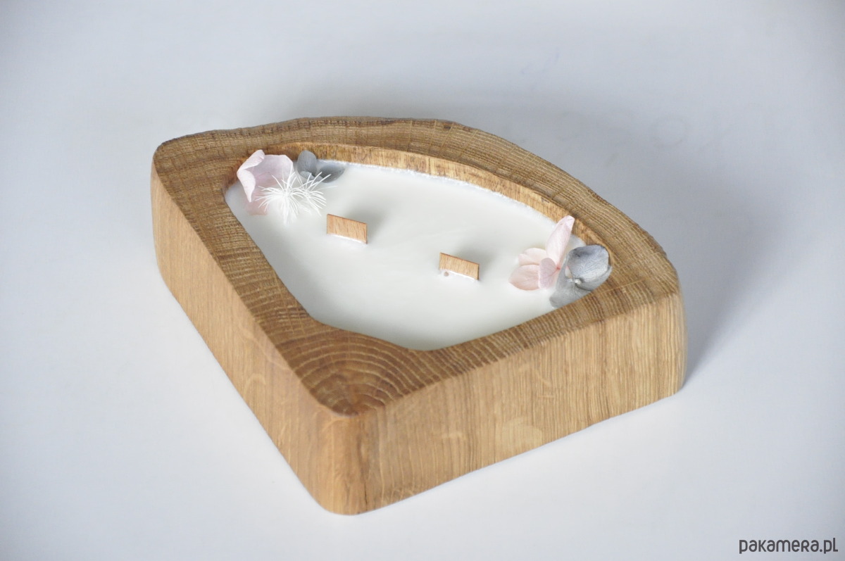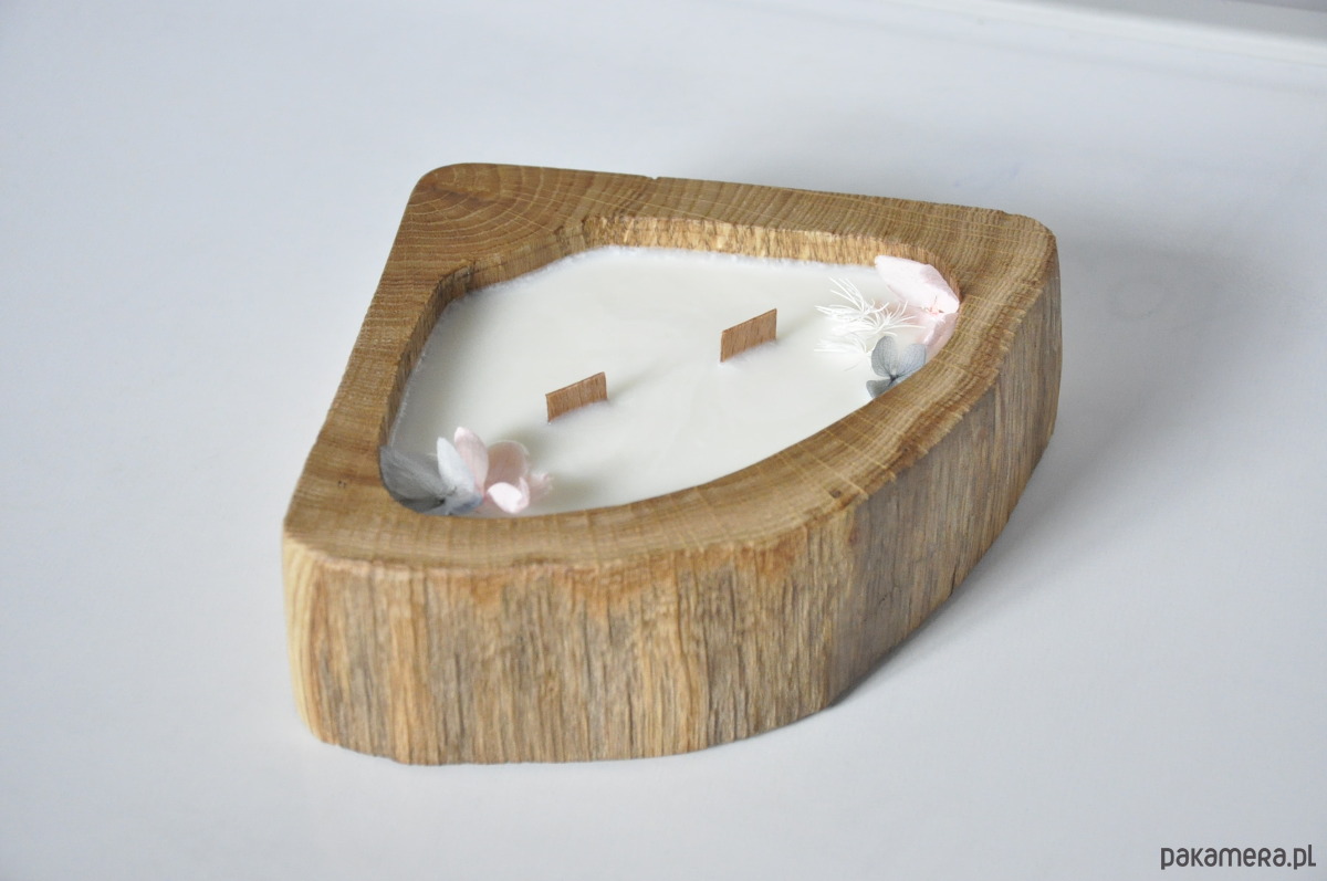 Drewniana forma – każda świeca powstaje w naturalnym kawałku dębu, co nadaje jej wyjątkowy charakter.