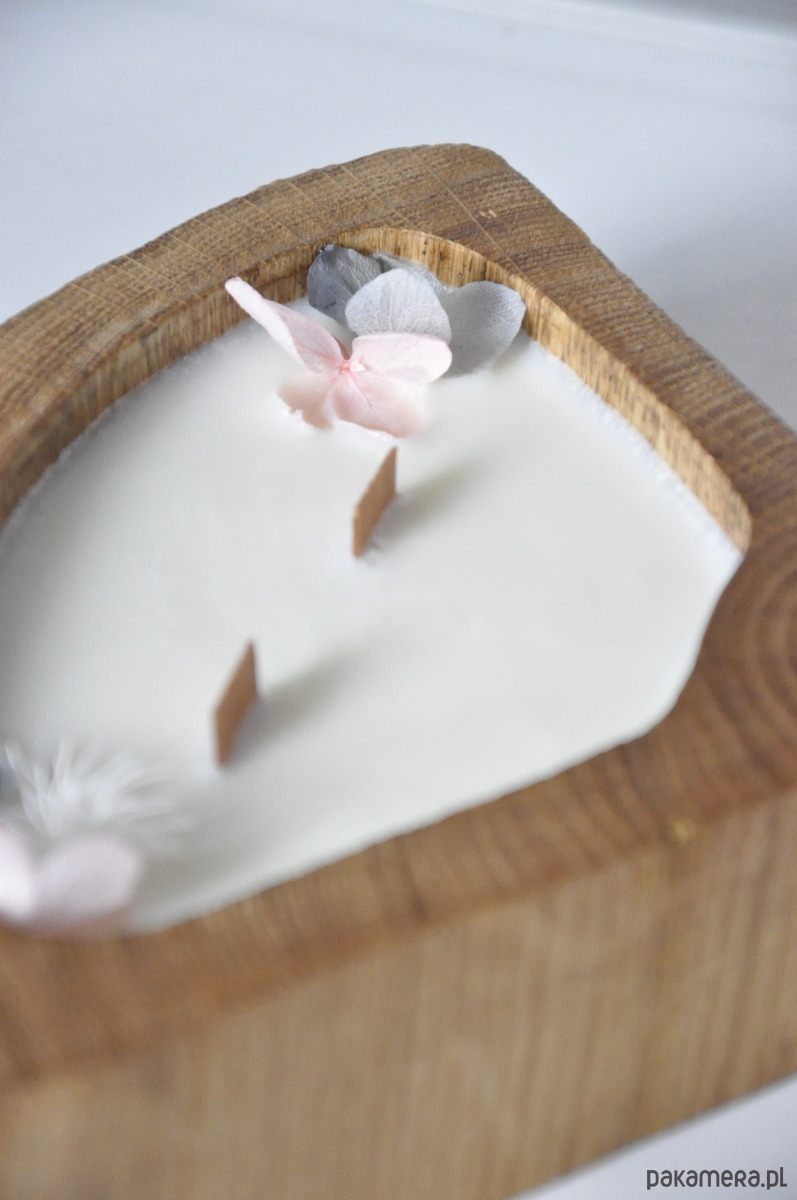 Wosk sojowy, drewniany knot i naturalny susz kwiatowy tworzą harmonijną całość, nadając świecy niepowtarzalny wygląd i zapach.