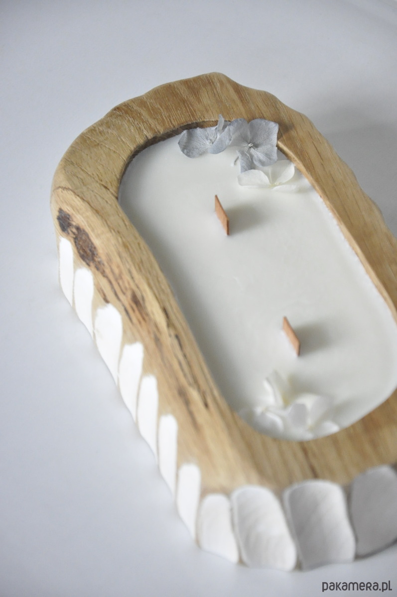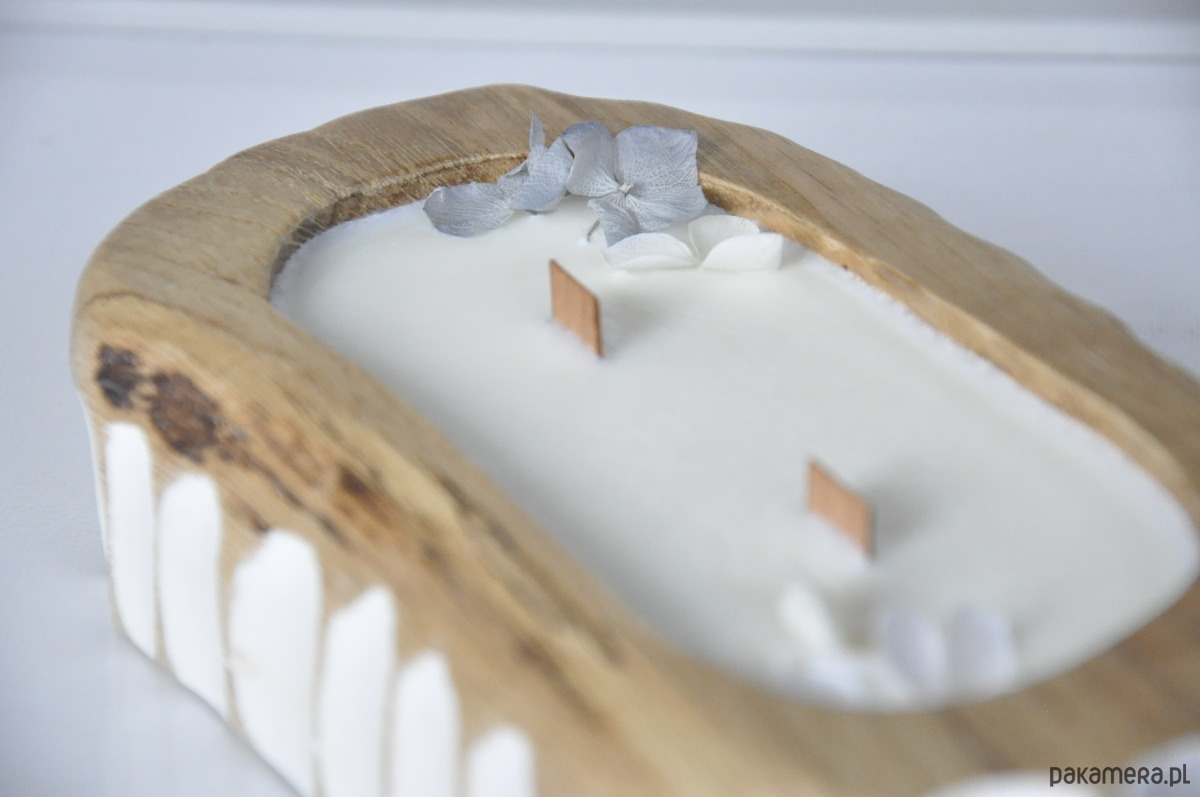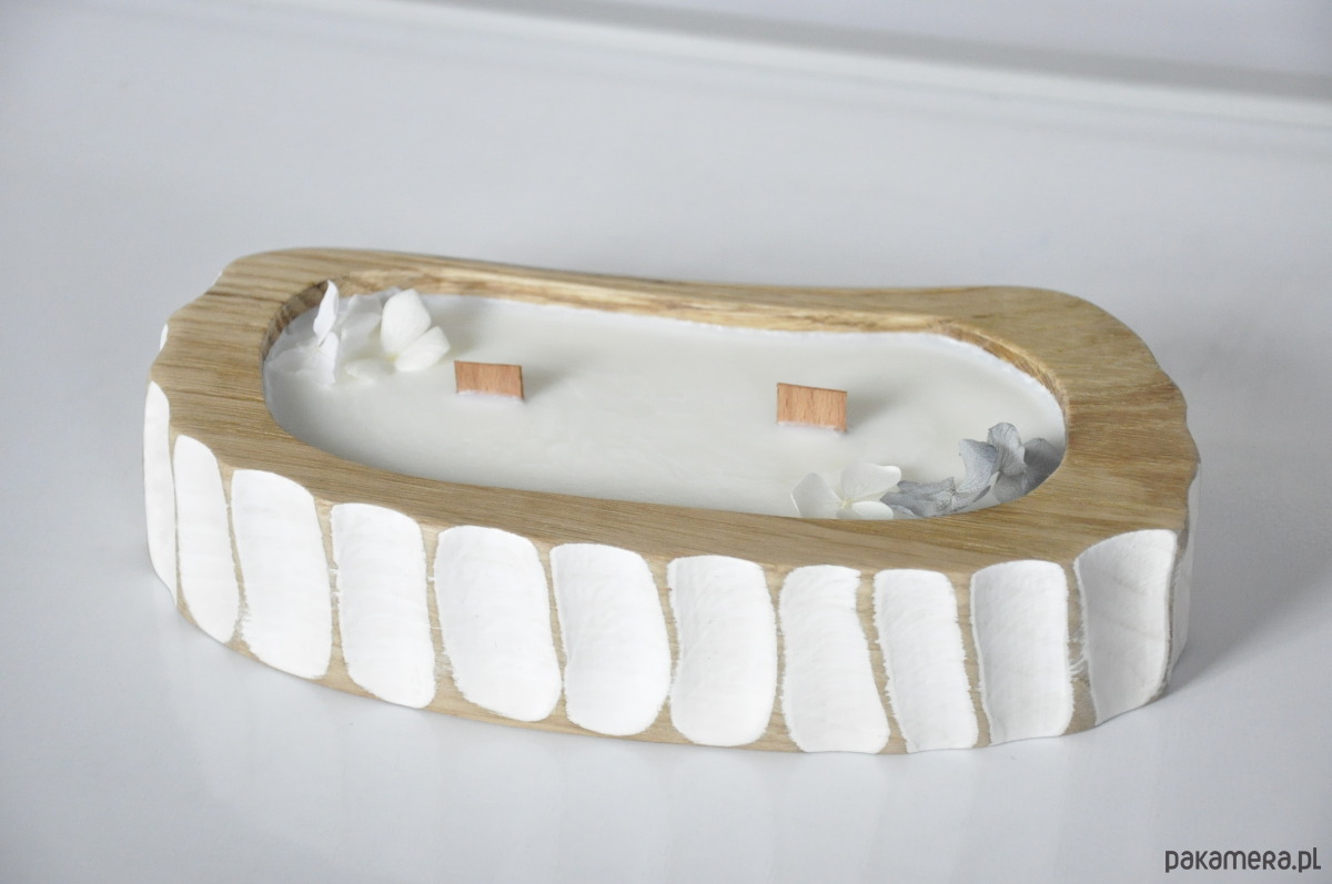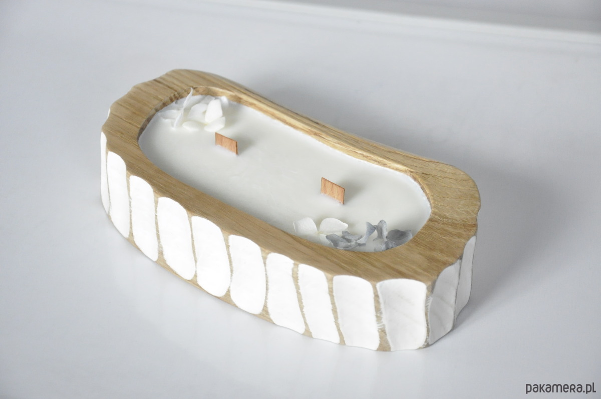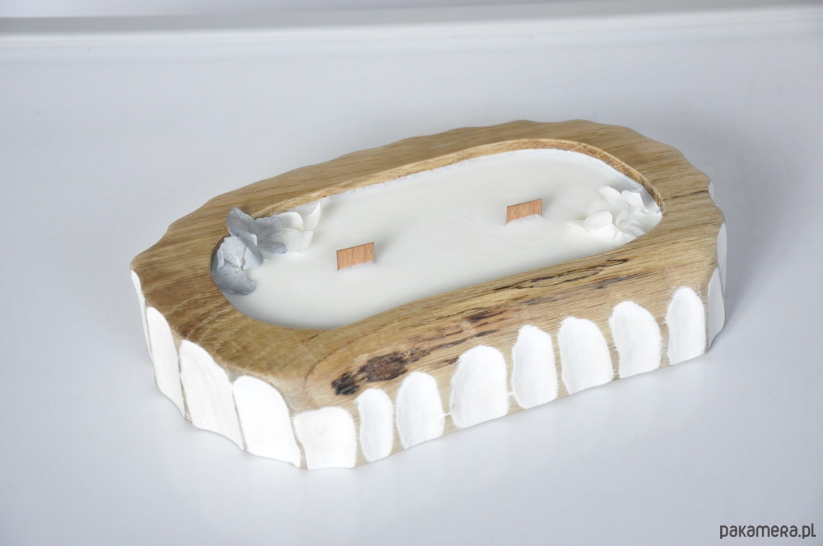 Drewniana forma – każda świeca powstaje w naturalnym kawałku dębu, co nadaje jej wyjątkowy charakter.