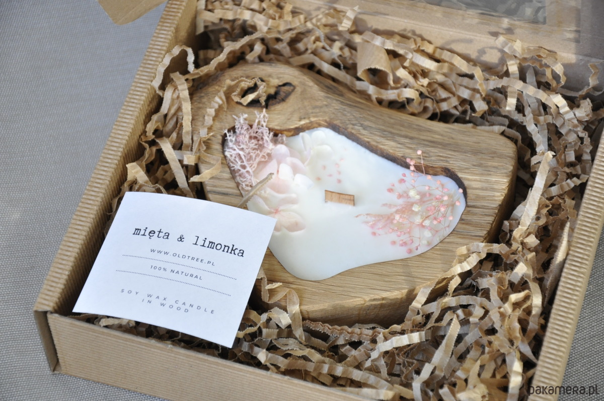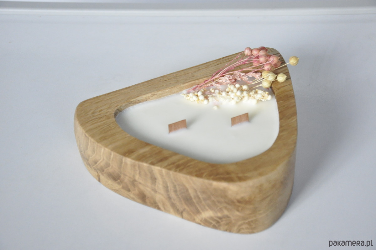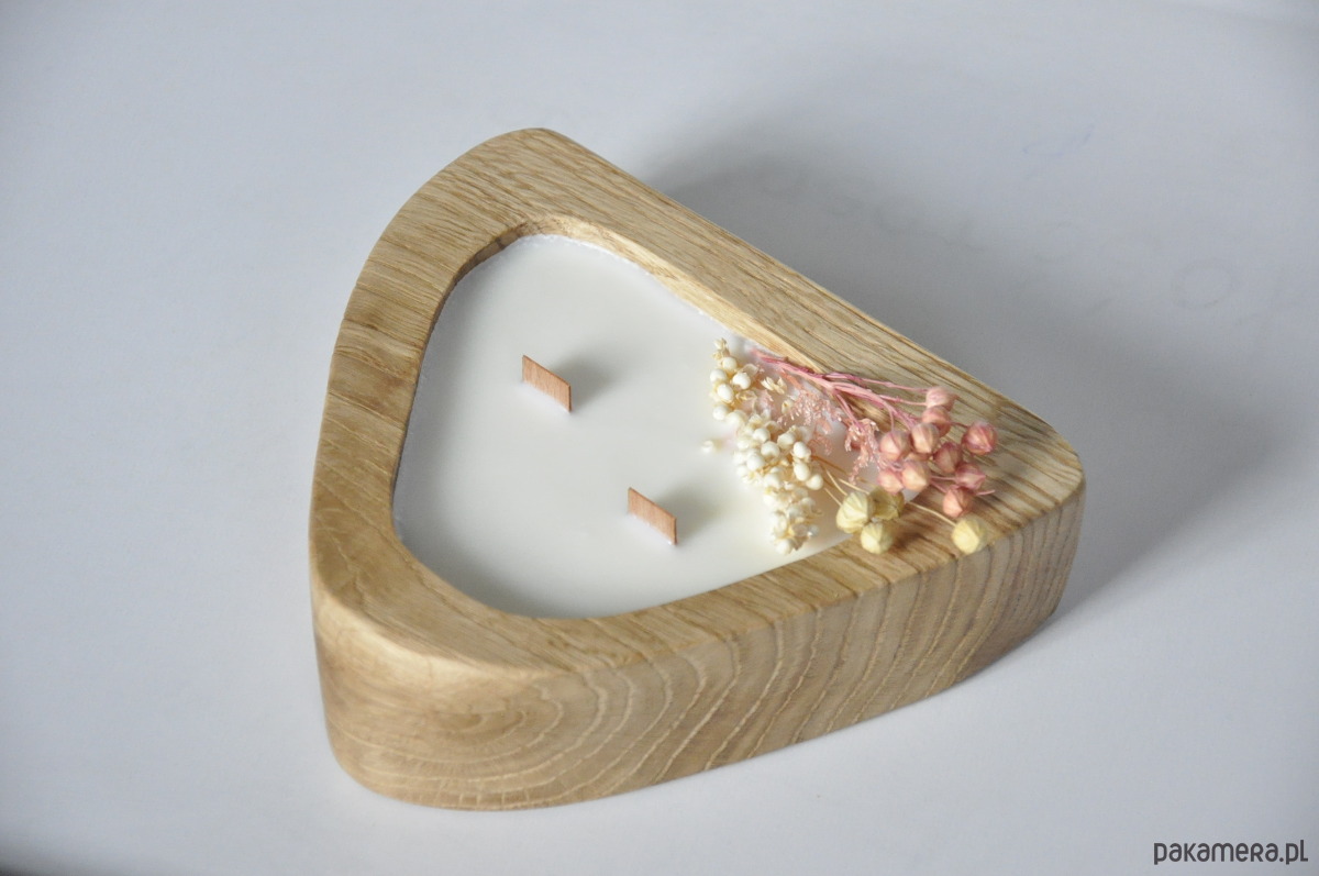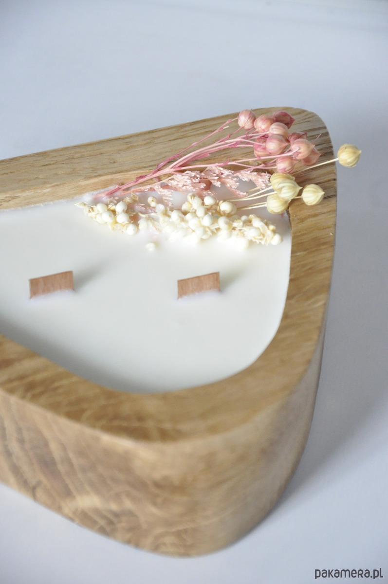 Drewniana forma – każda świeca powstaje w naturalnym kawałku dębu, co nadaje jej wyjątkowy charakter.