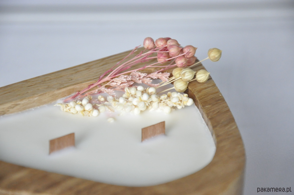 Wosk sojowy, drewniany knot i naturalny susz kwiatowy tworzą harmonijną całość, nadając świecy niepowtarzalny wygląd i zapach.