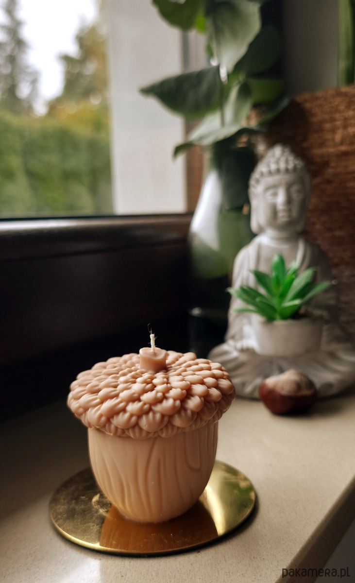 Ręcznie przygotowana świeca ozdobna z naturalnego wosku sojowego w kształcie żołędzia. Idealna jako drobny podarunek, sprawdzi się w wystroju w klimacie jesiennym i jako podarunek.