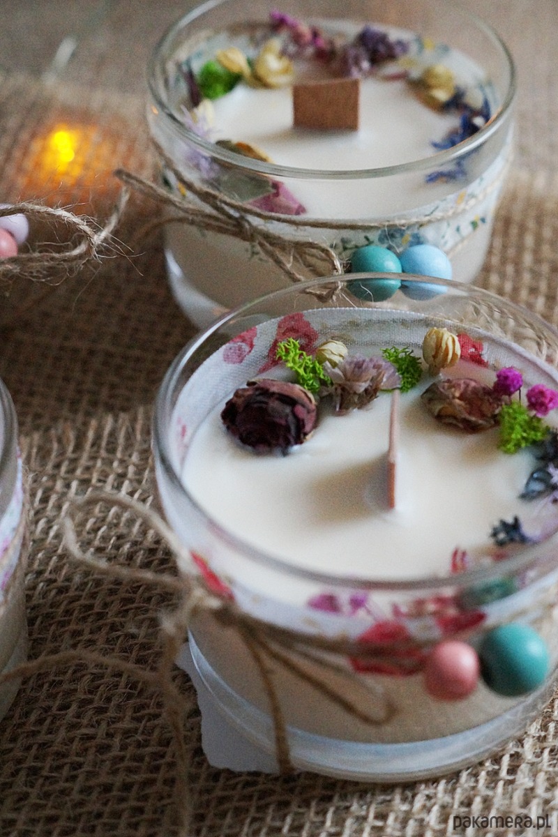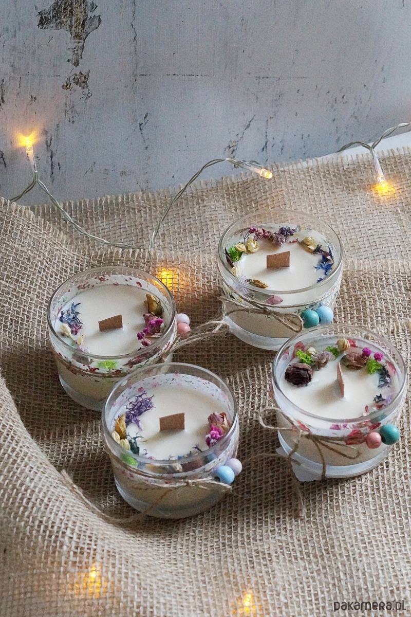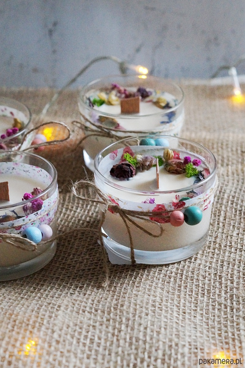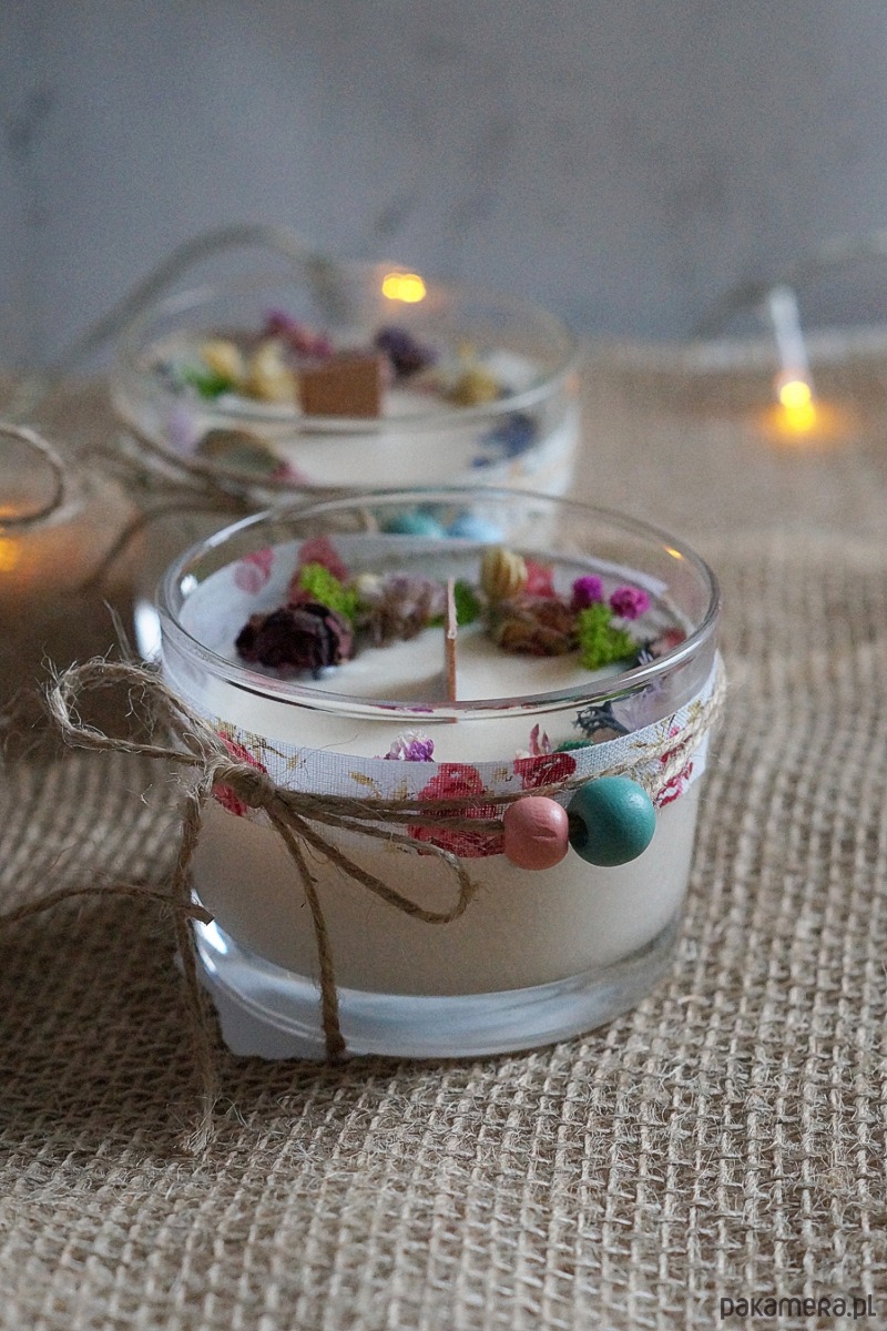 Skład: szkło, wosk sojowy, drewniany knot, suszone rośliny, naturalne olejki eteryczne, bawełniane wstążki, drewniane koraliki.
