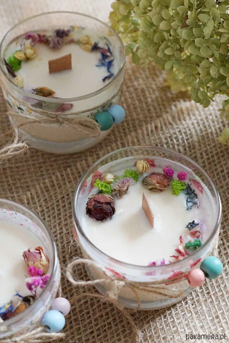 Naturalna świeca sojowa dekorowana suszonymi kwiatami, aromatyzowana - wybierz zapach.