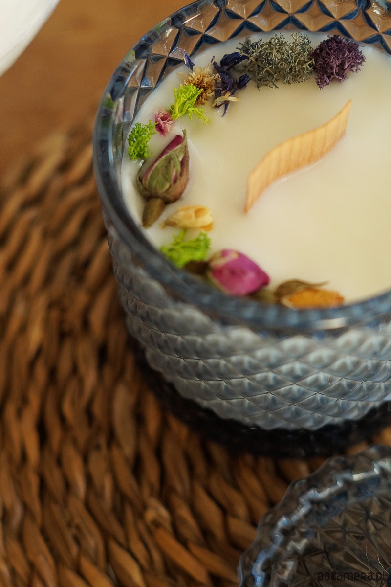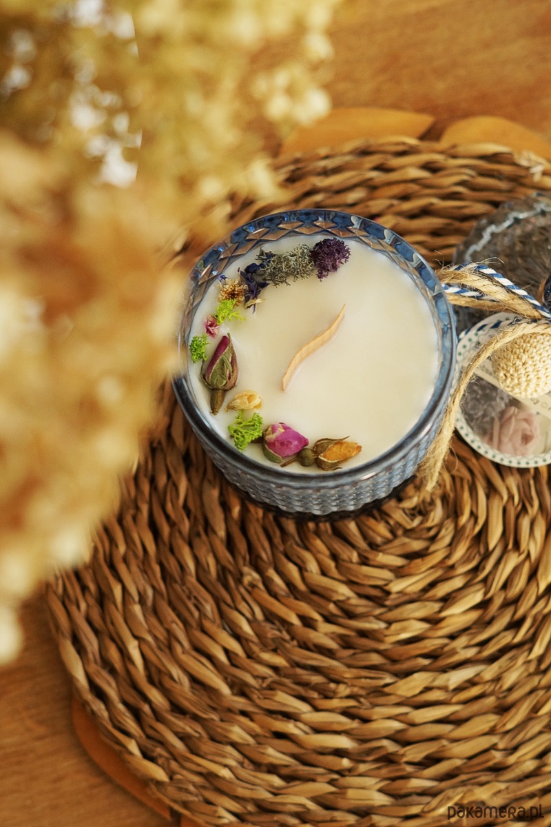 Skład: wosk sojowy, szklany pojemnik, drewniany knot, naturalne suszone rośliny. koralik drewniany powleczony bawełną.