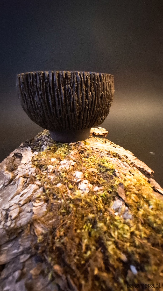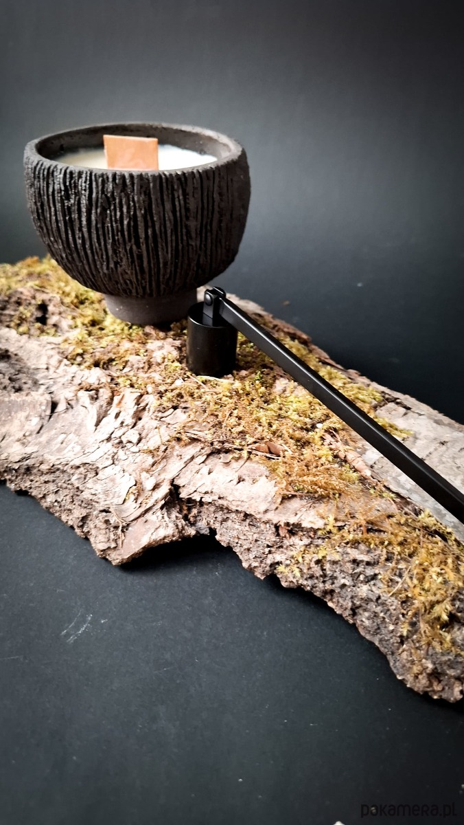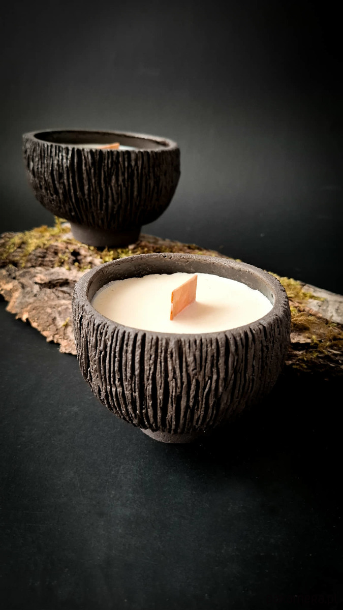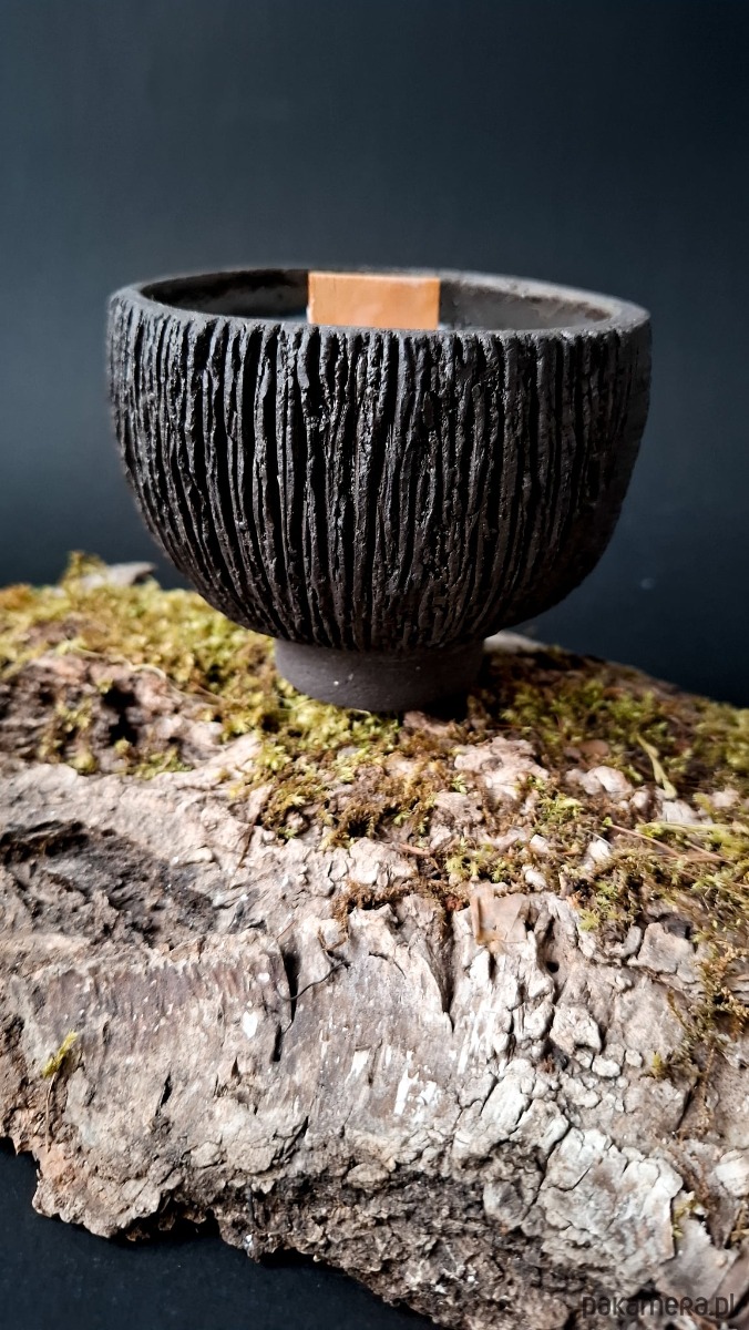 Ceramiczne naczynie na świece wykonane zostało ręcznie . Ścianki nieszkliwionych naczyń przypominają w wyglądzie ciosany łupek skalny. Ich zewnętrzna strona jest nieszkliwiona by podkreślić szlachetność i kolor materiału z jakiego są wykonane. Wnętrze czarki jest pokryte błyszczącym czarnym szkliwem kontrastującym z matem zewnętrza.