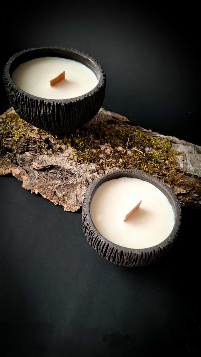 W czarkach znajdują się świece zalane w naszej pracowni z certyfikowanego naturalnego wosku oliwkowego.