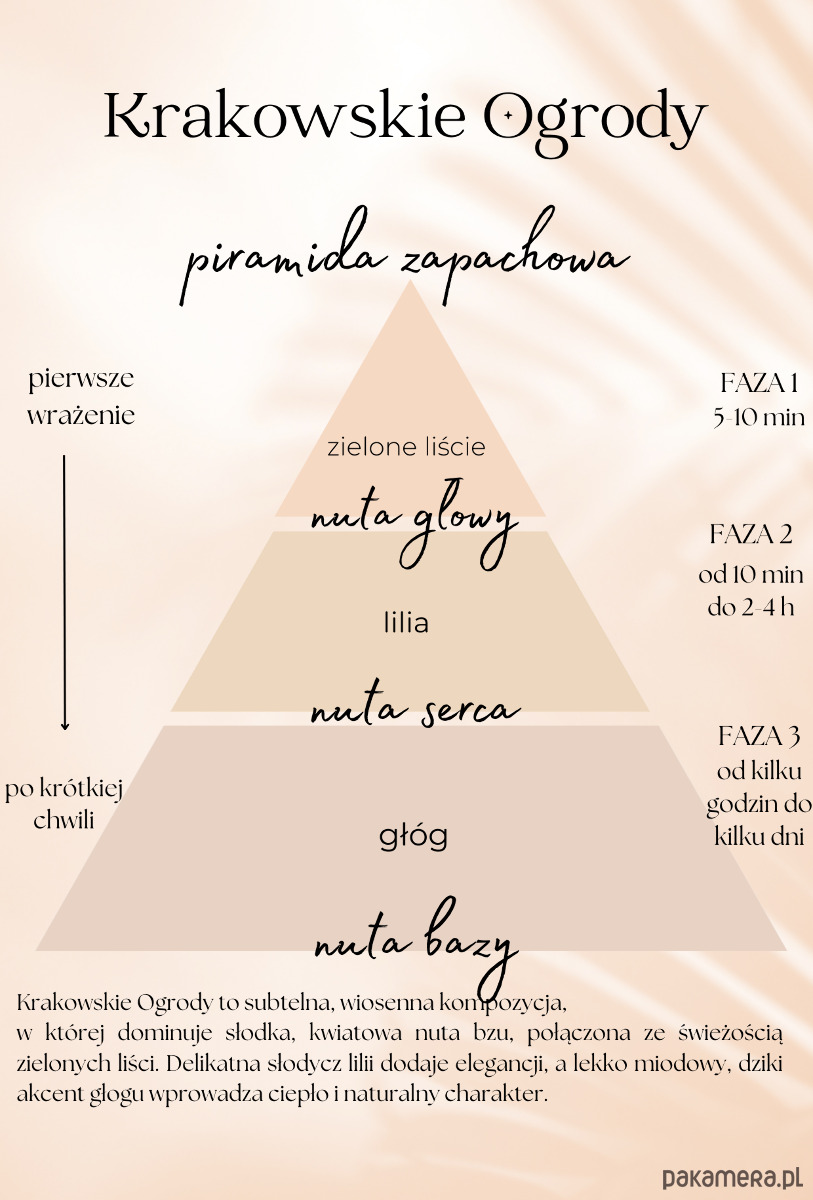 Słoneczne światło budzi do życia ukryte zakątki naszego rodzinnego Krakowa, niosąc ze sobą obietnicę beztroski. Krakowskie Ogrody to kompozycja, która zatrzymuje moment, w którym majowa zieleń jest najbardziej soczysta, a powietrze w wąskich uliczkach pachnie słodkim bzem. To aromat, który zamknęliśmy w szkle, by oddać świeżość porannej rosy na trawie. Zabierz cząstkę krakowskiej wiosny do swojego domu i pozwól, by nostalgia rozkwitła w Twoim wnętrzu.
