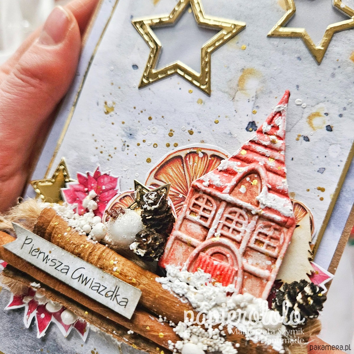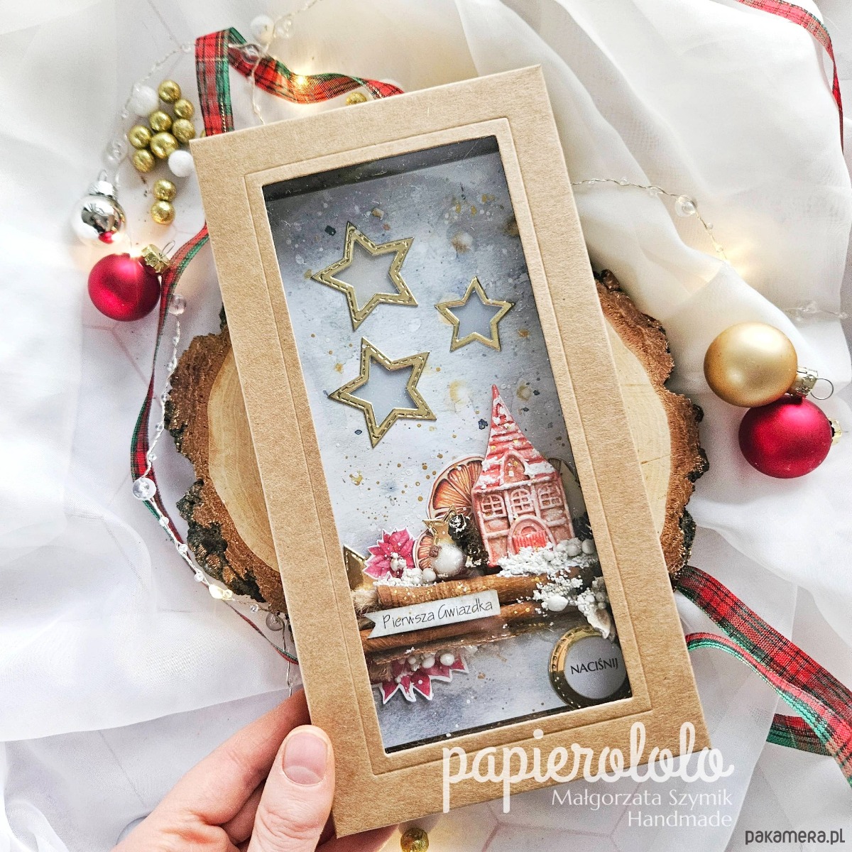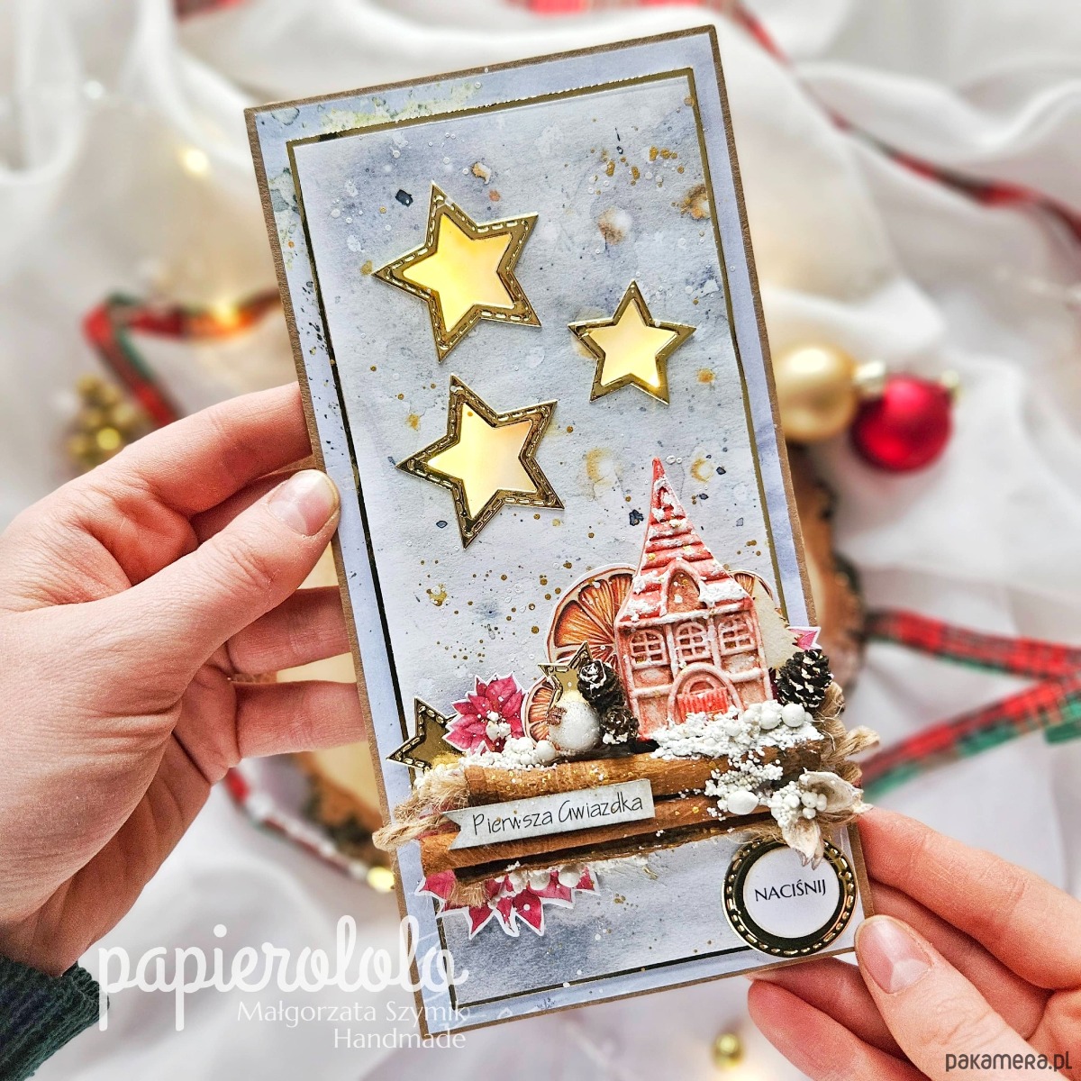 Szczegóły: Kartka oklejona graficznymi papierami. Całość ozdobiona dodatkami z papieru, odlewem gipsowym i ledami, które włączają się wciśnięciu przycisku "naciśnij".