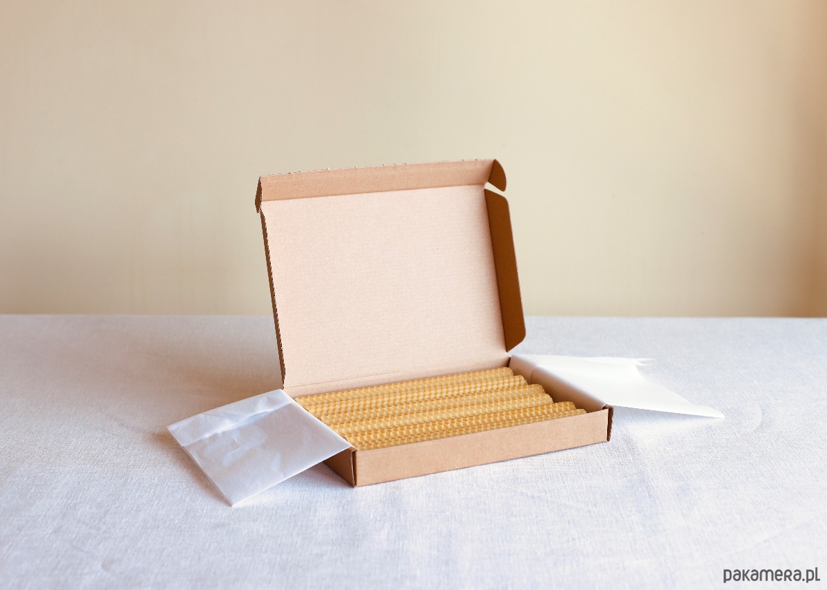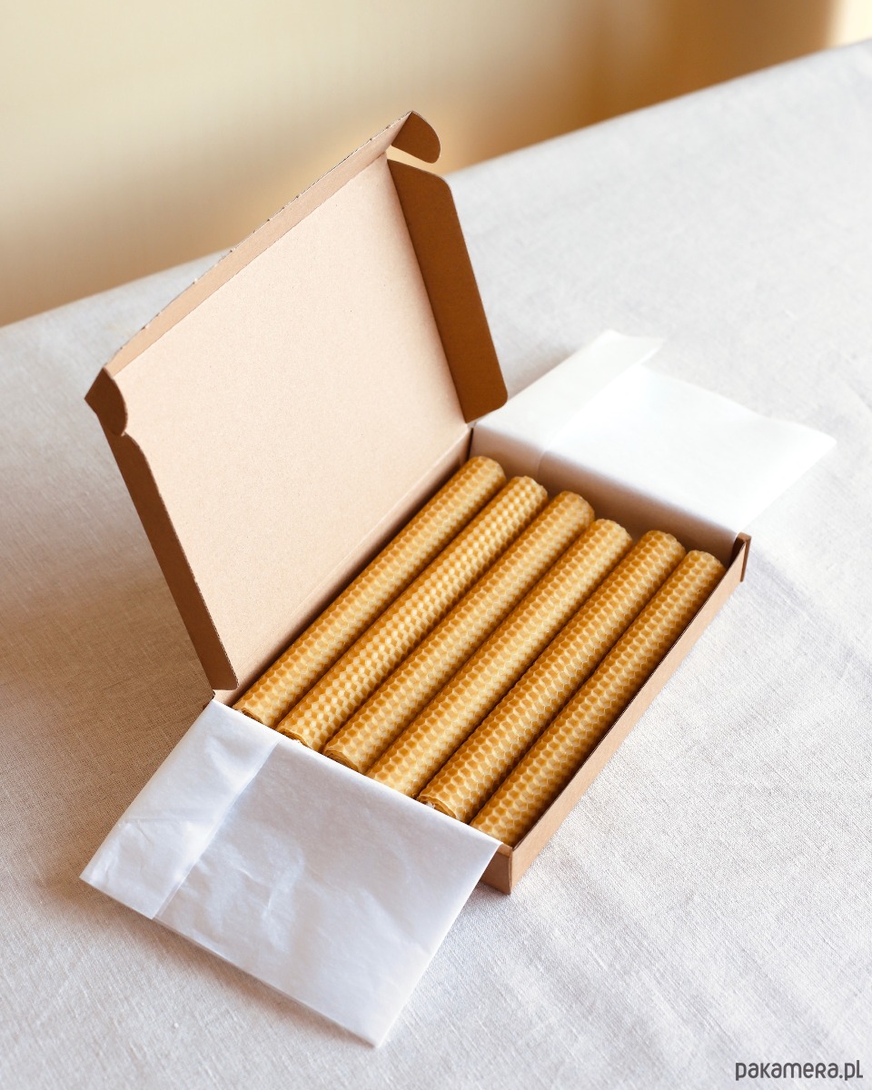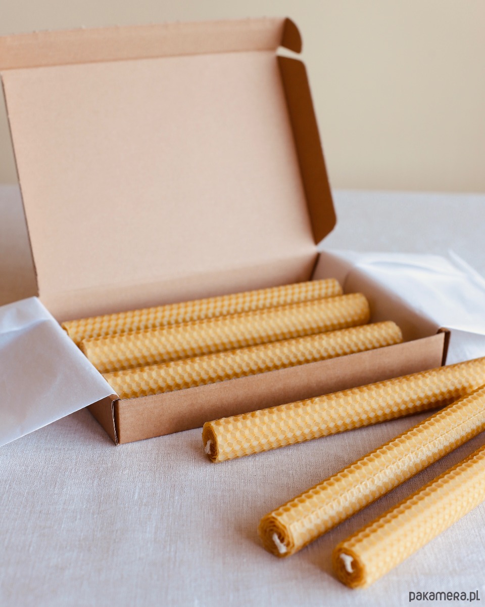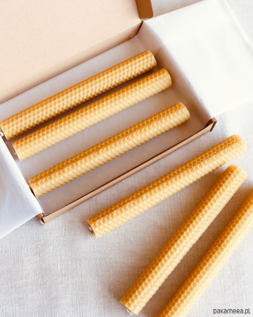 Świeca wykonana w 100% z wosku pszczelego z bawełnianym knotem. Świece stołowe sprzedawane są w zestawie 6 sztuk, cena podana za zestaw.