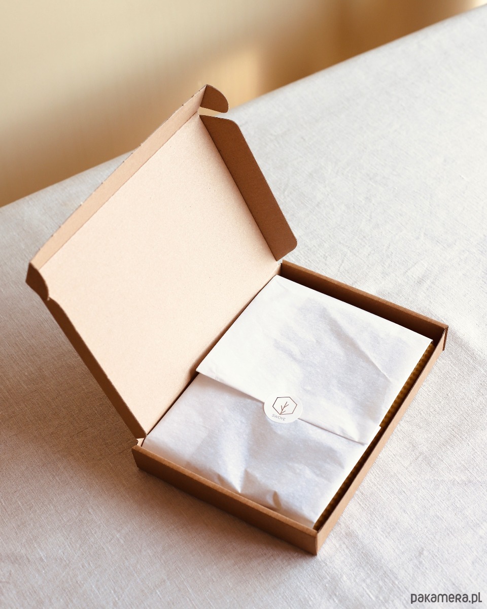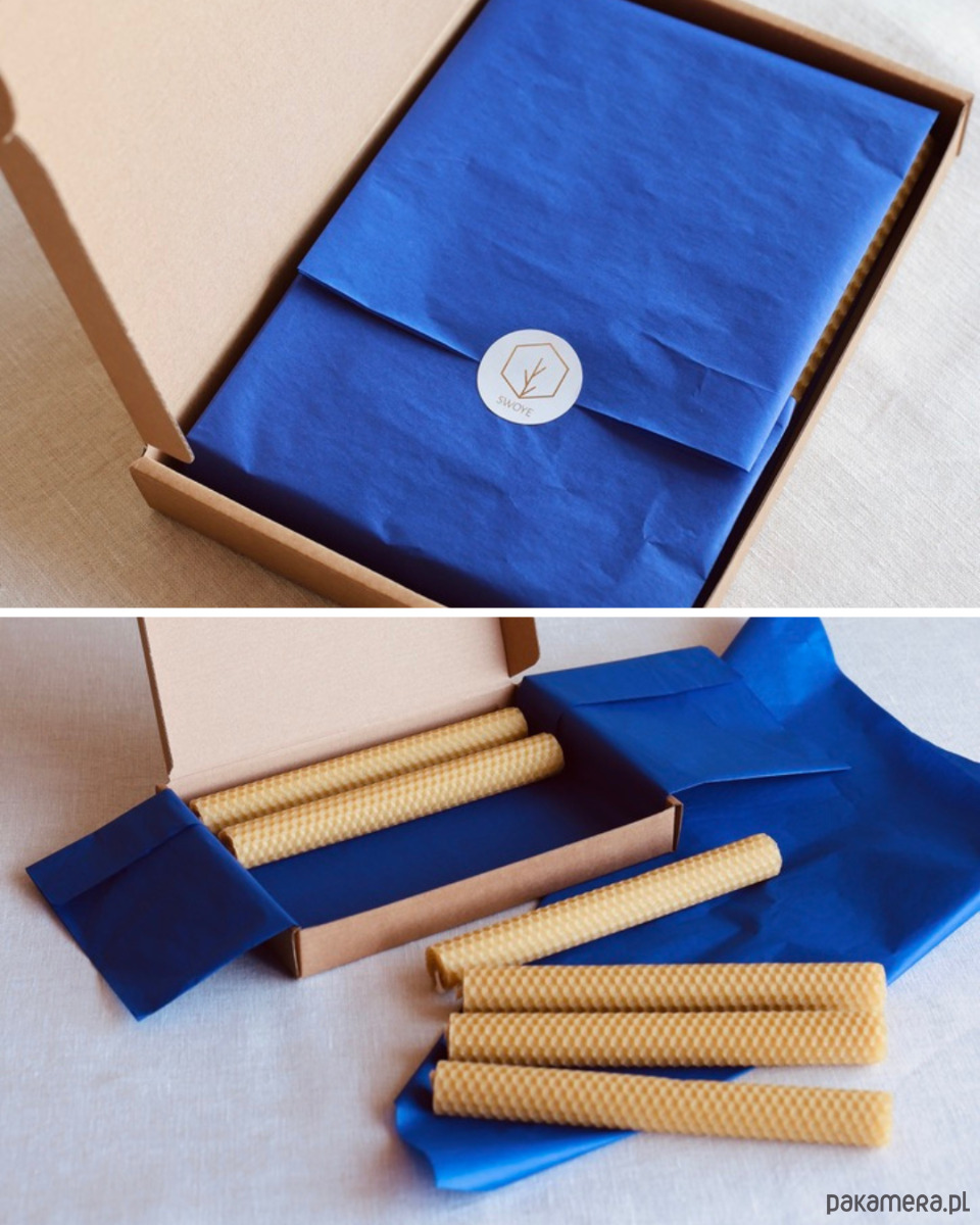 Zapakowane w papierowe pudełko, zawinięte elegancką bibułą ze złotym logo Swoye.