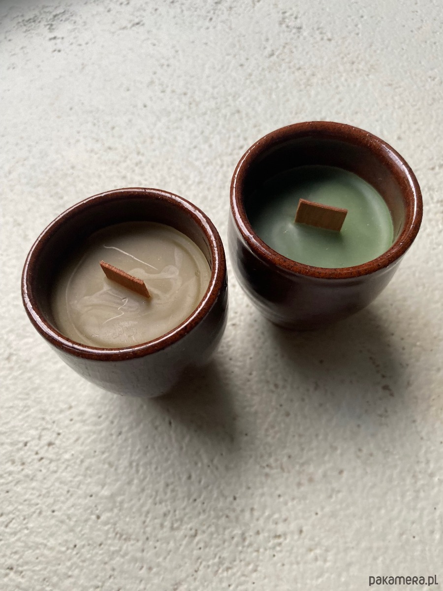 Dwie świece z ekologicznego wosku pszczelo-sojowego. Barwione na dwa odcienie zieleni. O przyjemnym miodowym zapachu. Kamionkowym pojemnik. Drewniany knot.