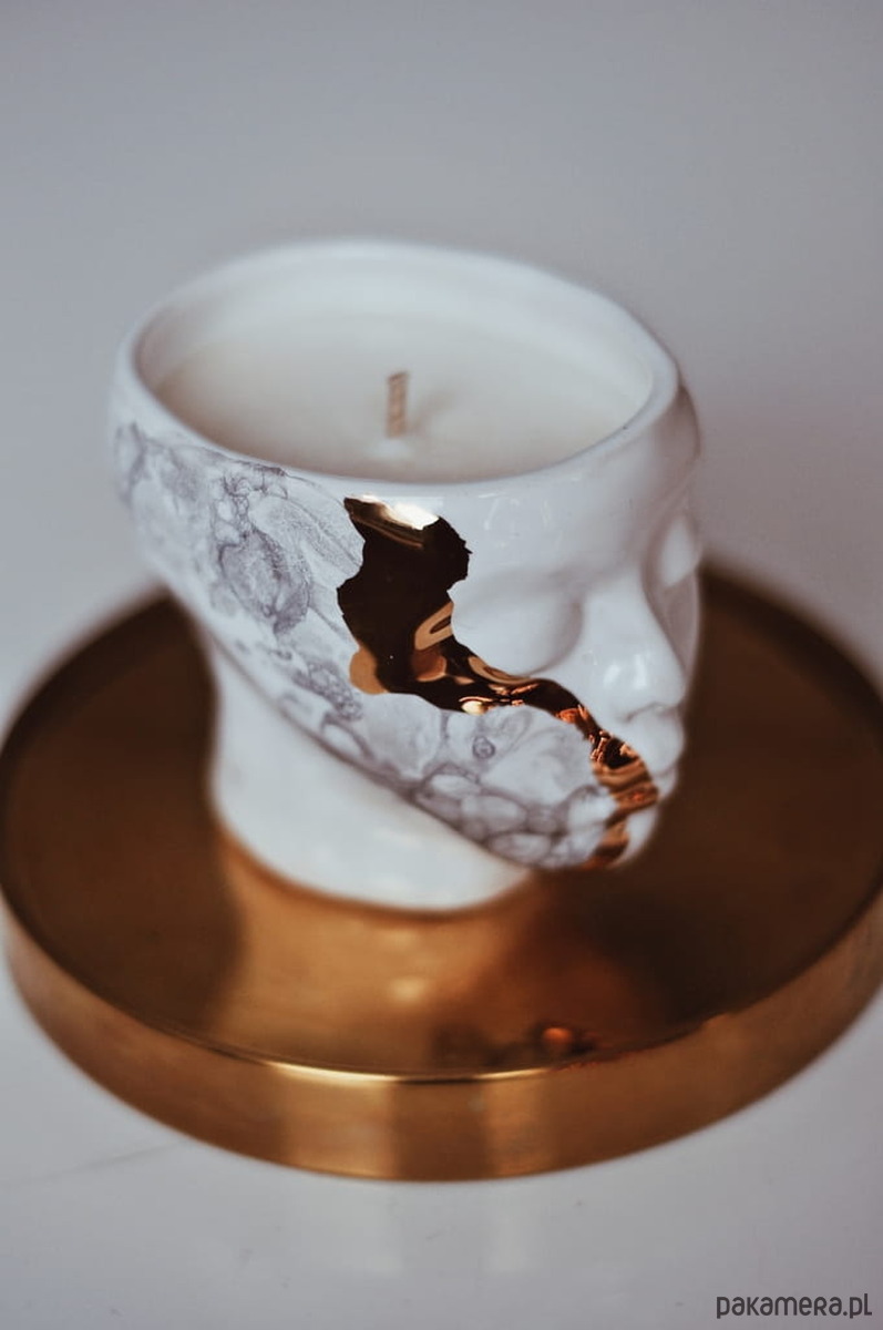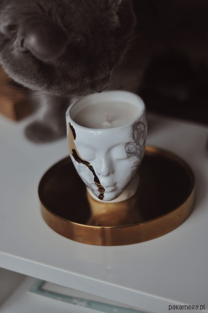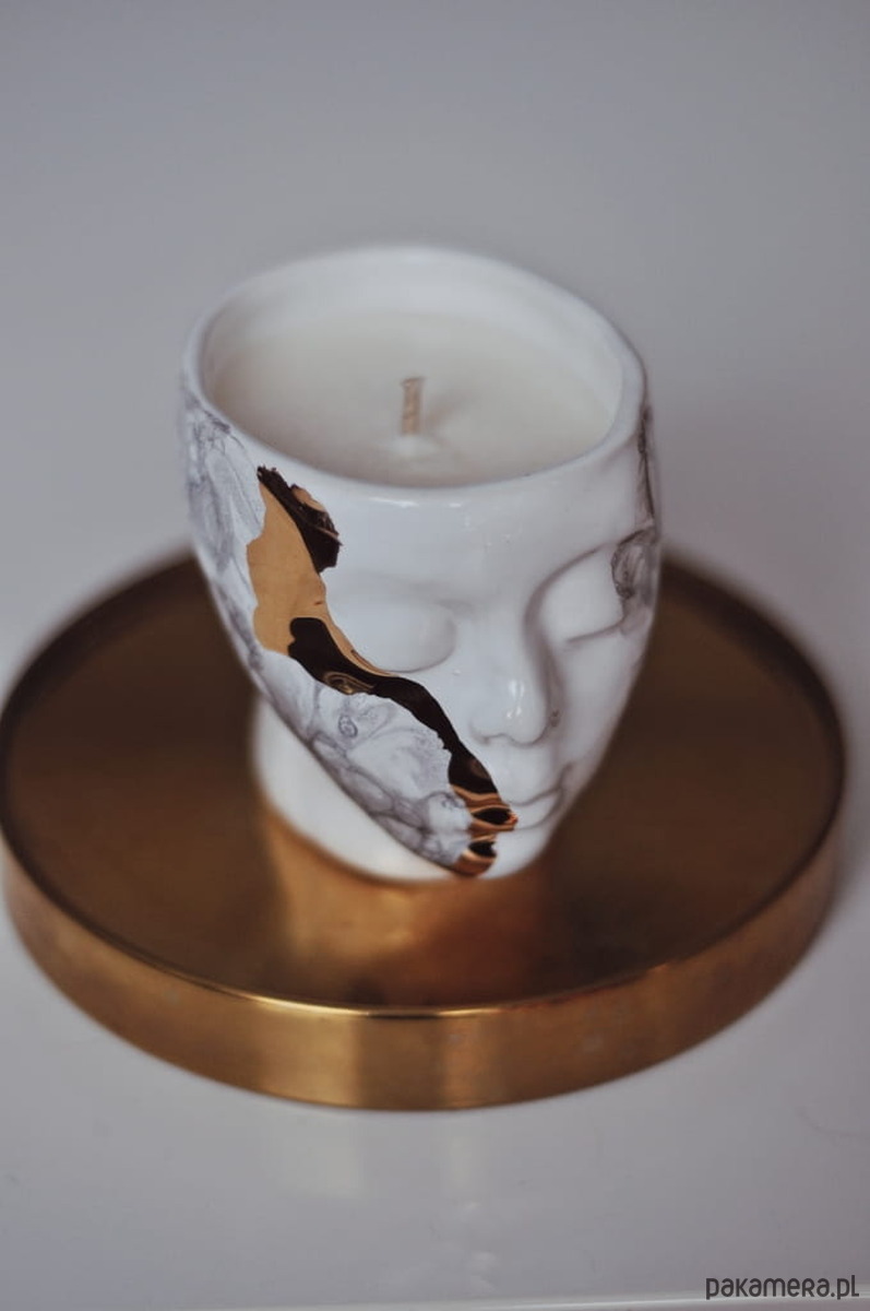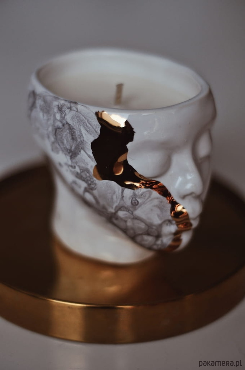 Wyjątkowa świeczka zamknięta w ręcznie formowanej ceramice w kształcie twarzy – każda sztuka to unikalne dzieło! Edycja GOLD zdobiona jest prawdziwym 24-karatowym złotem (99,99%), które dodaje jej elegancji i subtelnego blasku. To nie tylko świeca – to designerska ozdoba wnętrza.