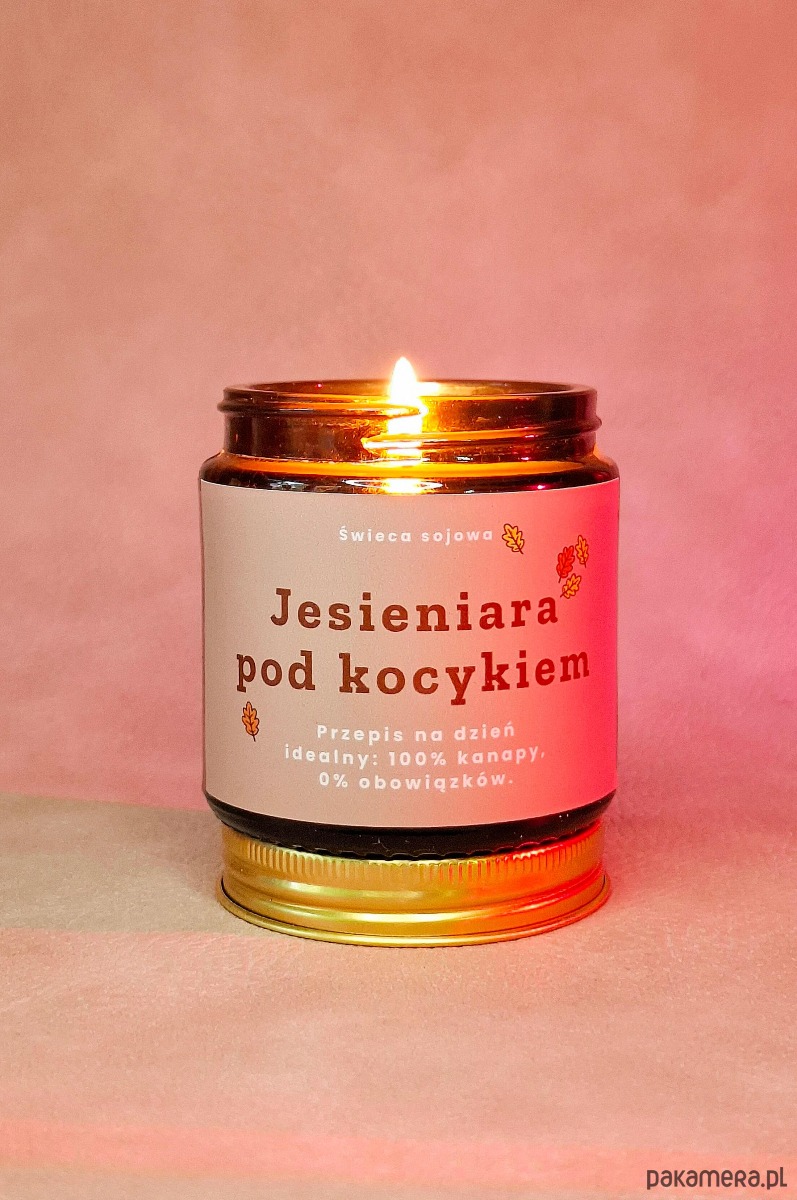 Świeczka sojowa Jesieniara pod kocykiem, pojemność 120ml(93g). Skład: wosk sojowy, kompozycja zapachowa, bawełniany knot.