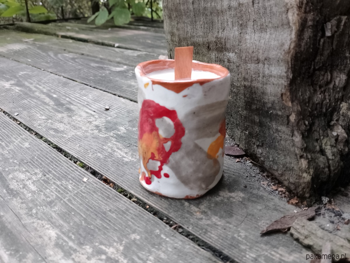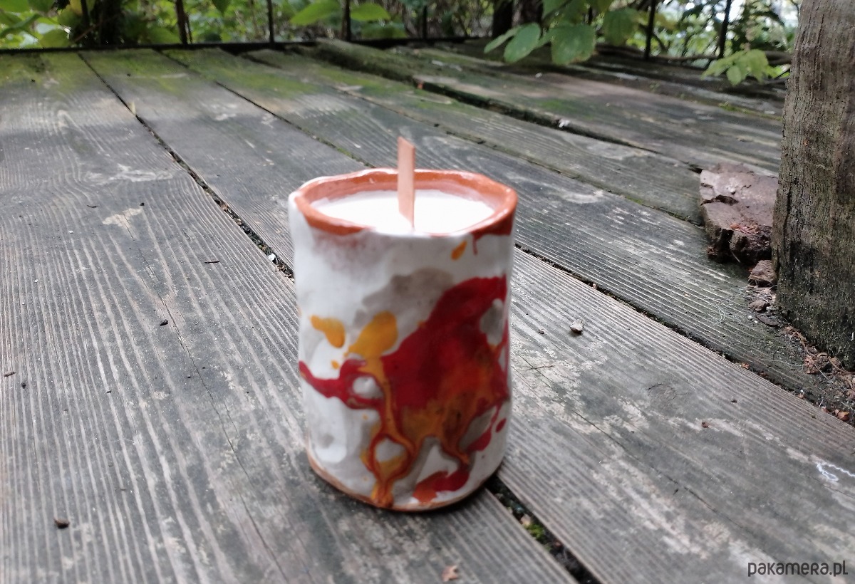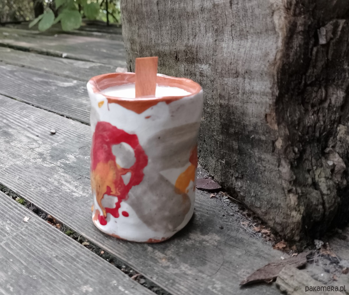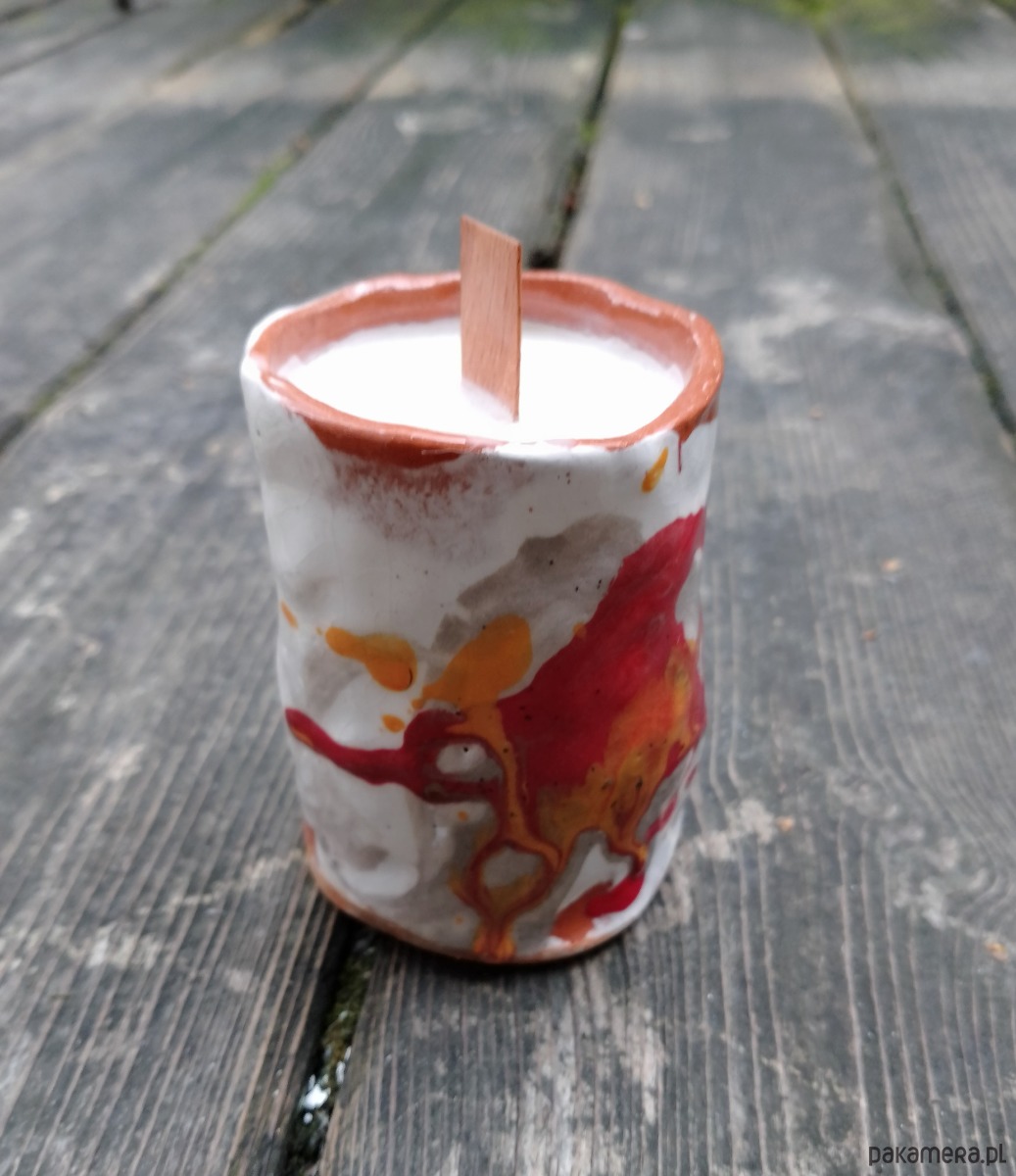 Świeca sojowa w ceramicznym naczynku. Zapach kwiatów i piękny blask światła odbijający się wewnątrz naczynia z czerwonej gliny.
