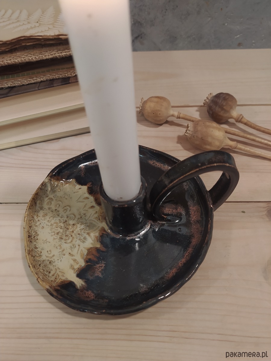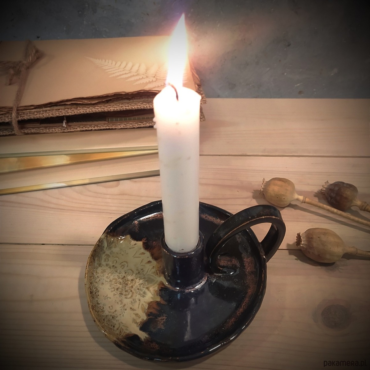 Świecznik ceramiczny, kaganek lepiony ręcznie w czarnym kolorze z dodatkiem miedzi.