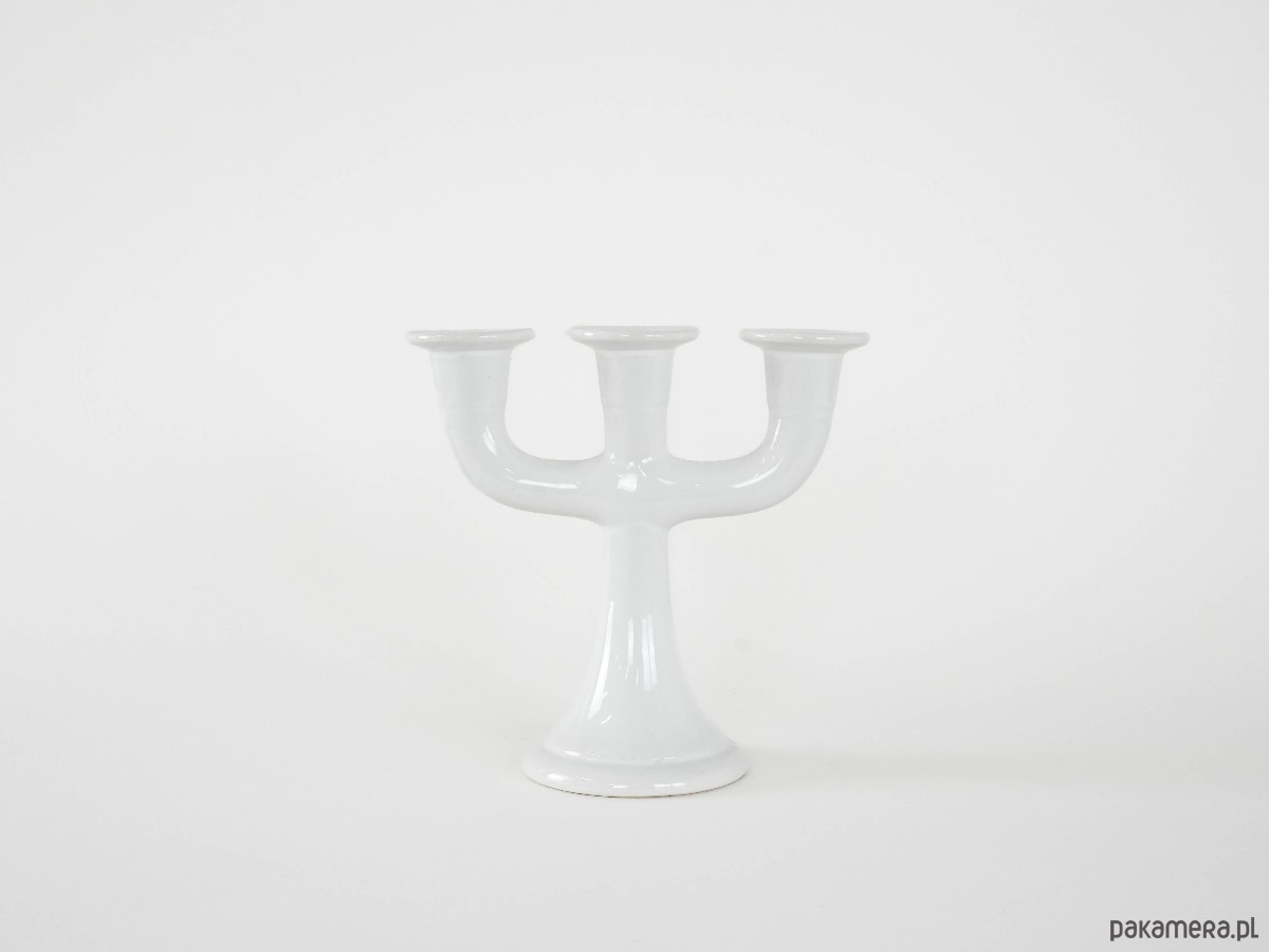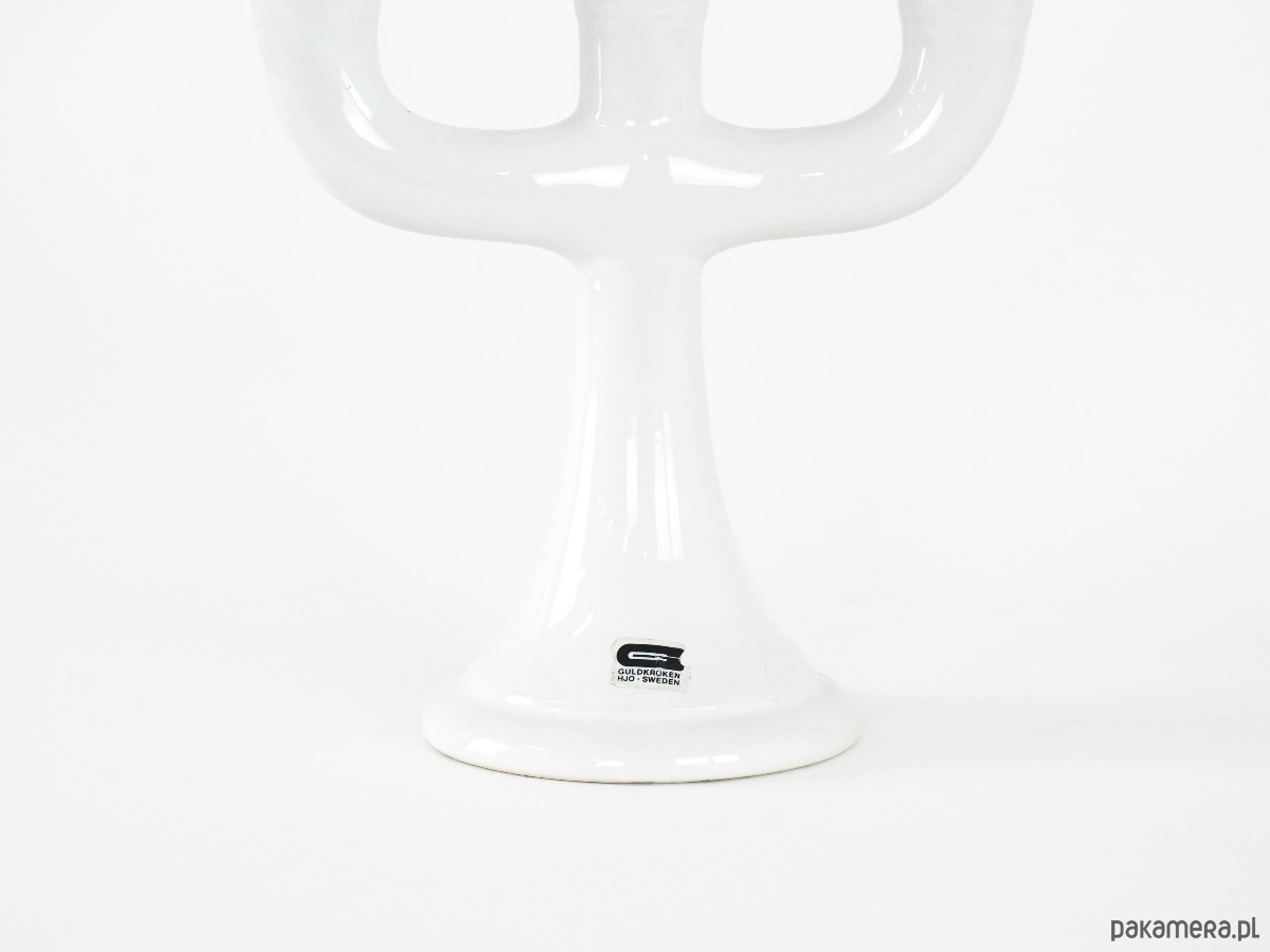 Vintage biały świecznik ceramiczny firmy Guldkroken Hjo, Szwecja, datowany na drugą połowę XX wieku. Trzyramienna forma o opływowych liniach reprezentuje charakterystyczny dla skandynawskiego designu minimalizm i elegancję. Doskonały element dekoracyjny, który łączy funkcjonalność z ponadczasową estetyką.