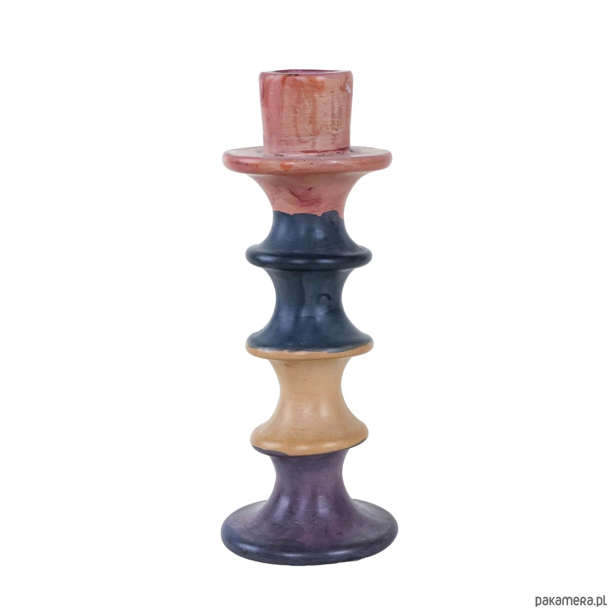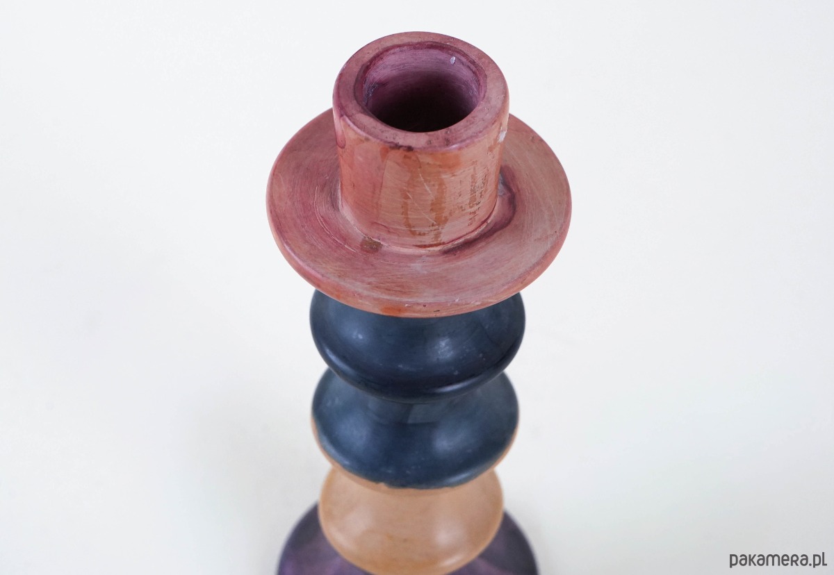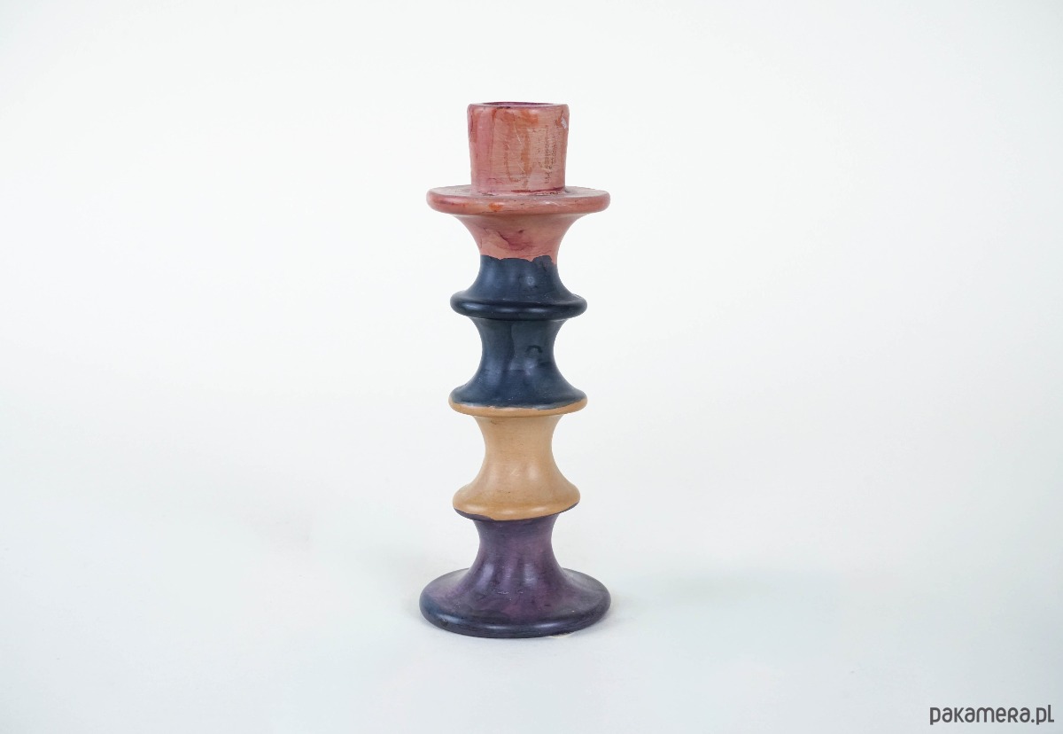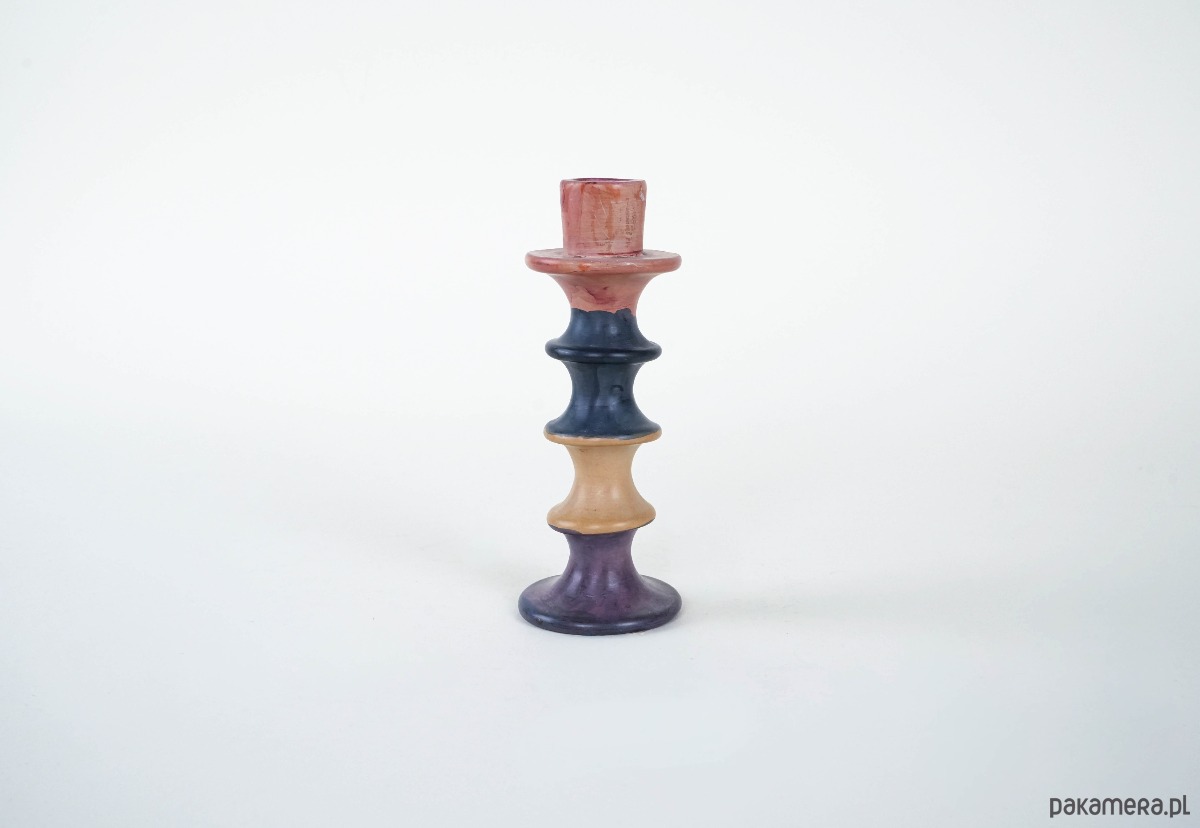 Oryginalny świecznik o geometrycznej, toczonej formie, wykonany z ceramiki. Pokryty szkliwem w odcieniach czerwieni, granatu, fioletu oraz beżu – barwy płynnie przechodzą między sobą, tworząc efektowną, dekoracyjną całość. Jego organiczna sylwetka i kolorystyka przywołują estetykę lat 60. i 70. XX wieku. Idealny do wnętrz w stylu mid-century modern, retro czy eklektycznych aranżacji.