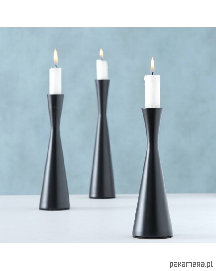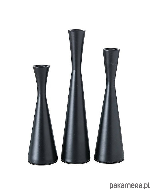 Komplet 3 czarnych świeczników wykonanych z aluminium, które mają ciekawy, wysmukły kształt. Są różnej wysokości i przeznaczone na pojedyncze świece. Będą się pięknie prezentowały na komodzie, stole lub parapecie okiennym jako dekoracyjna kompozycja.