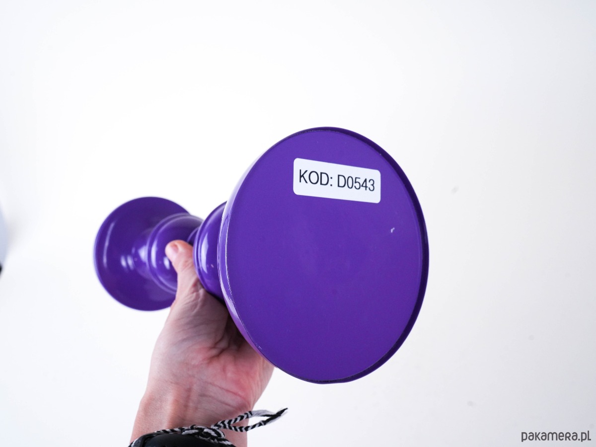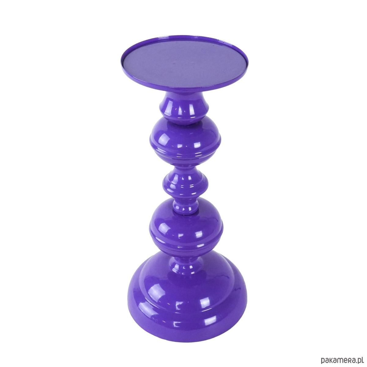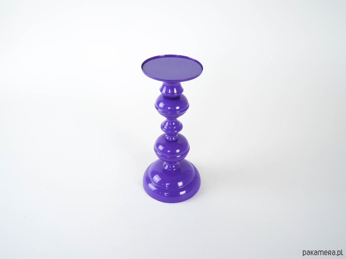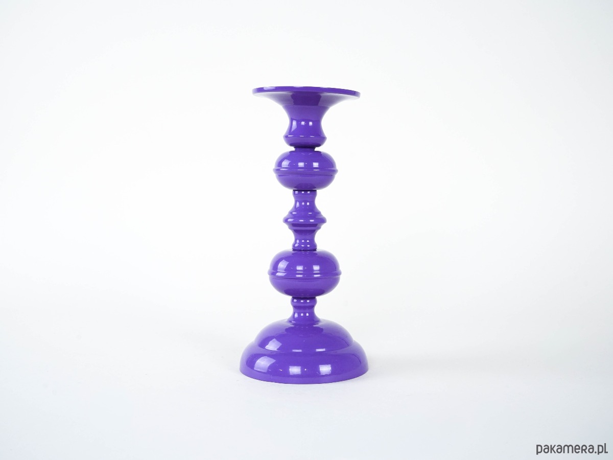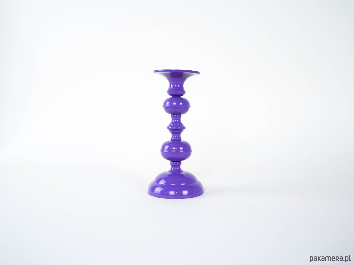 Solidny, ciężki świecznik wykonany z metalu, pokryty intensywnym, fioletowym lakierem. Rzeźbiarska forma z kulistymi i stożkowymi elementami przywodzi na myśl klasyczne duńskie wzornictwo lat 60. i 70. XX wieku. Jego wyrazista barwa i geometryczna sylwetka czynią z niego wyjątkowy akcent dekoracyjny w nowoczesnym lub retro wnętrzu.