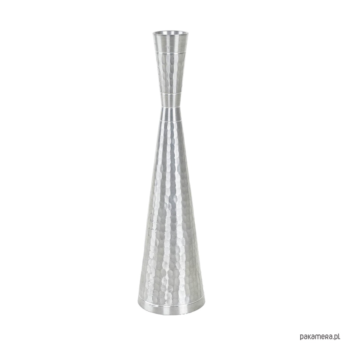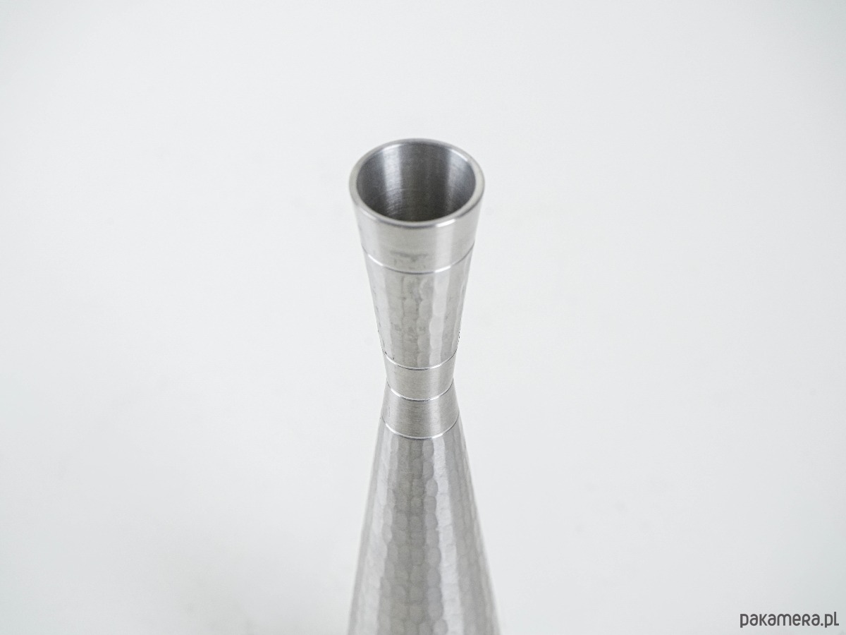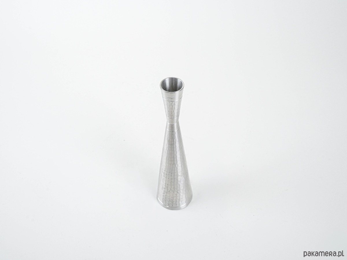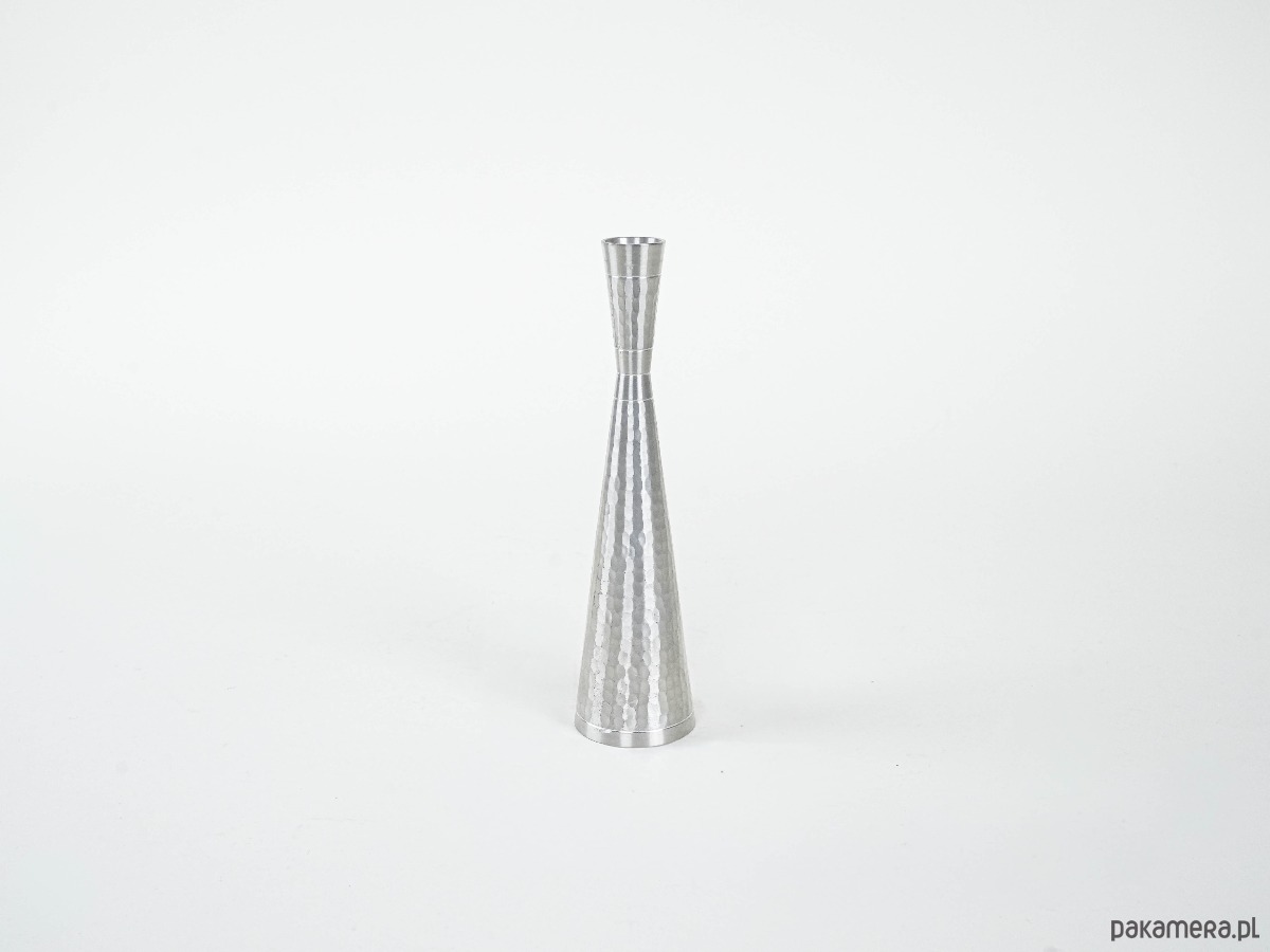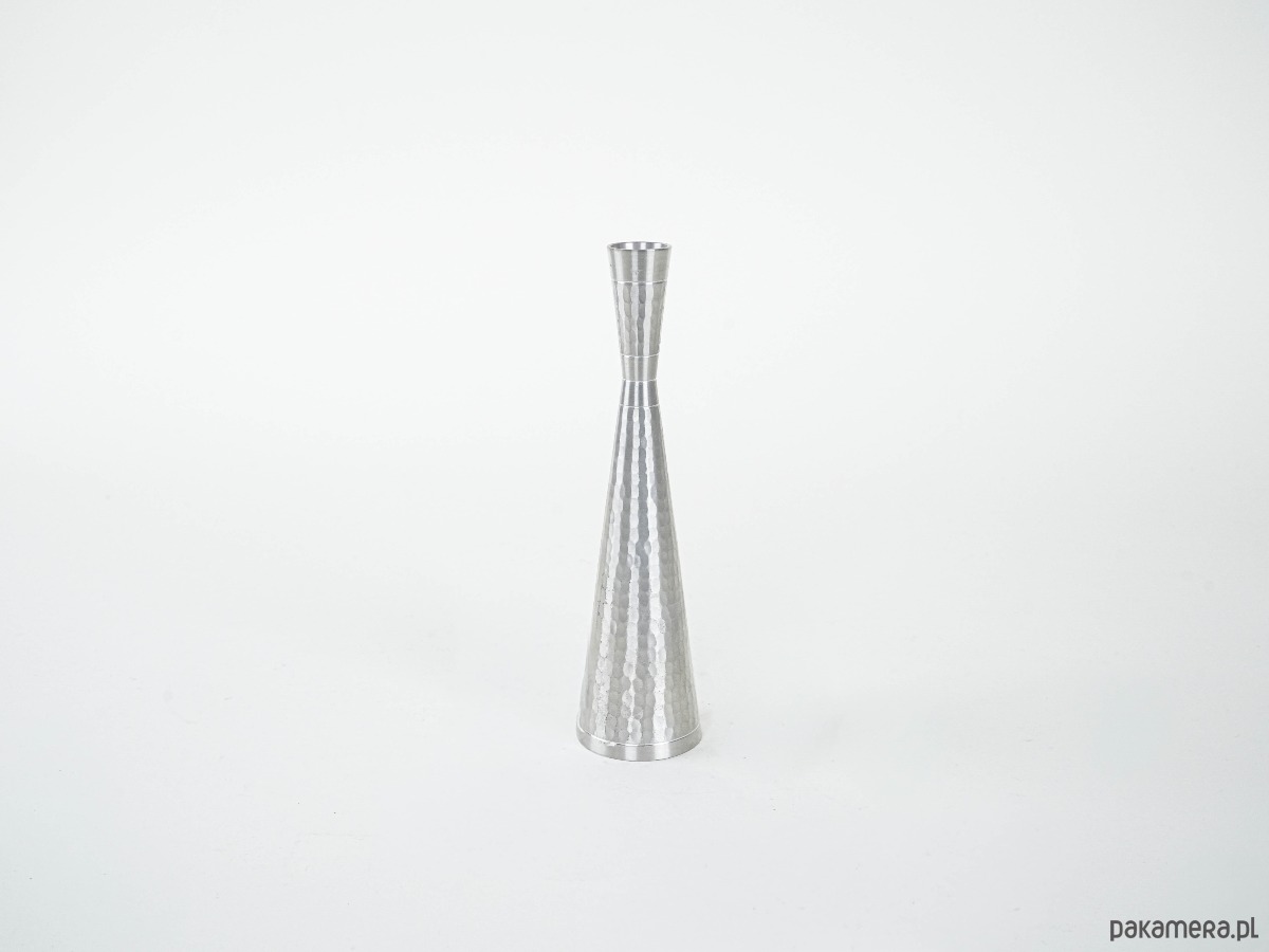 Elegancki świecznik w stylu Mid Century Modern, wykonany z metalu o młotkowanej fakturze. Smukła, geometryczna forma zwężająca się ku górze nadaje mu nowoczesny charakter, a ręczne wykończenie powierzchni podkreśla unikatowość przedmiotu. Doskonały jako akcent dekoracyjny w minimalistycznych i vintage aranżacjach.