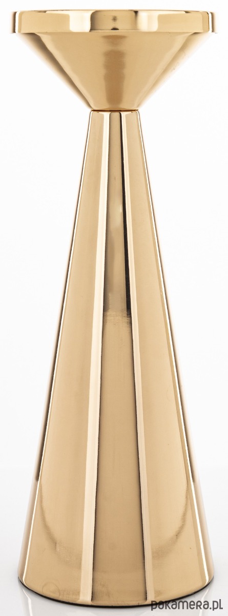 Metalowy świecznik przeznaczony na jedną świecę. Utrzymany w kolorze złotym. Elegancki i subtelny. Będzie ozdobą każdego stołu.